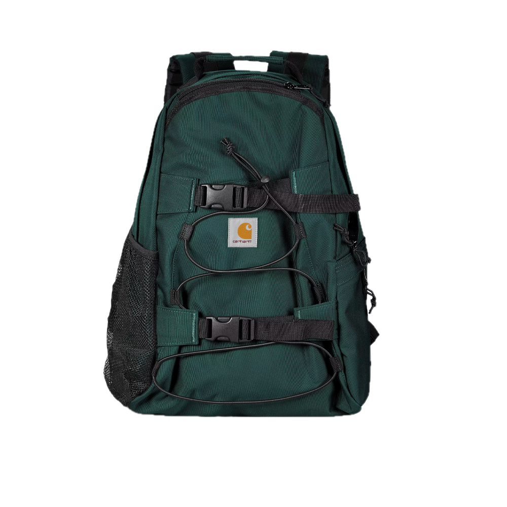 Realizzato in tela misto poliestere riciclato, il Kickflip Backpack di Carhartt WIP senza fodera è un modello impermeabile. Presenta tasche laterali in rete e con zip e chiusura con zip a due vie. Spallacci e schienale sono imbottiti per un effetto ammortizzante, mentre le fibbie e le cinghie anteriori per il trasporto dello skateboard offrono funzionalità extra.