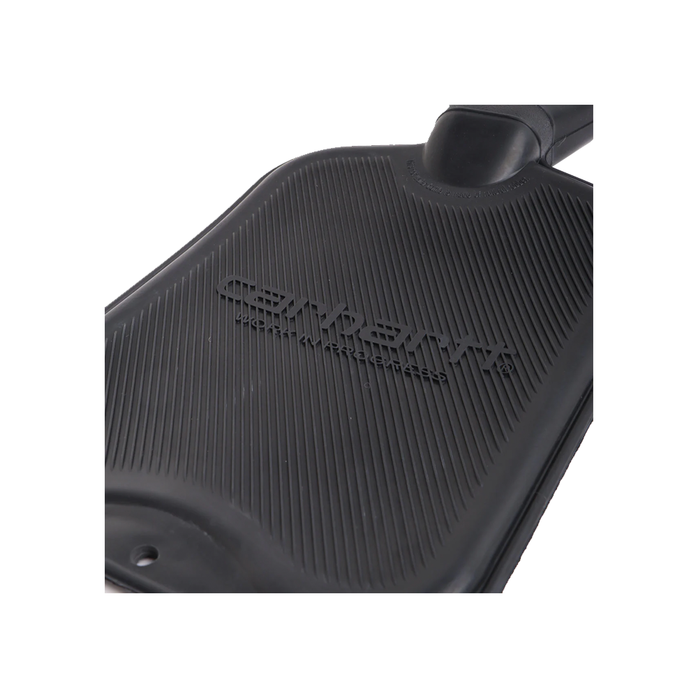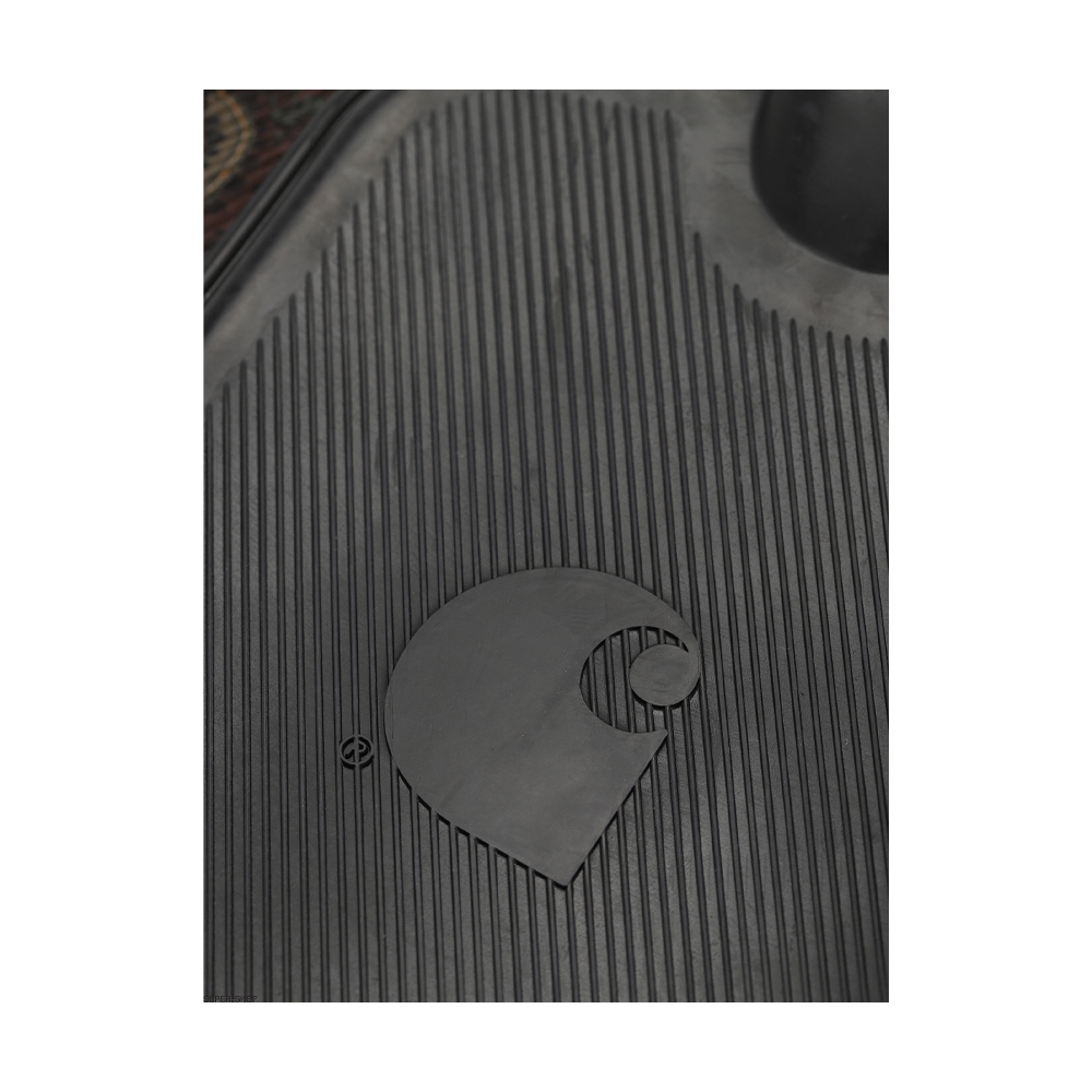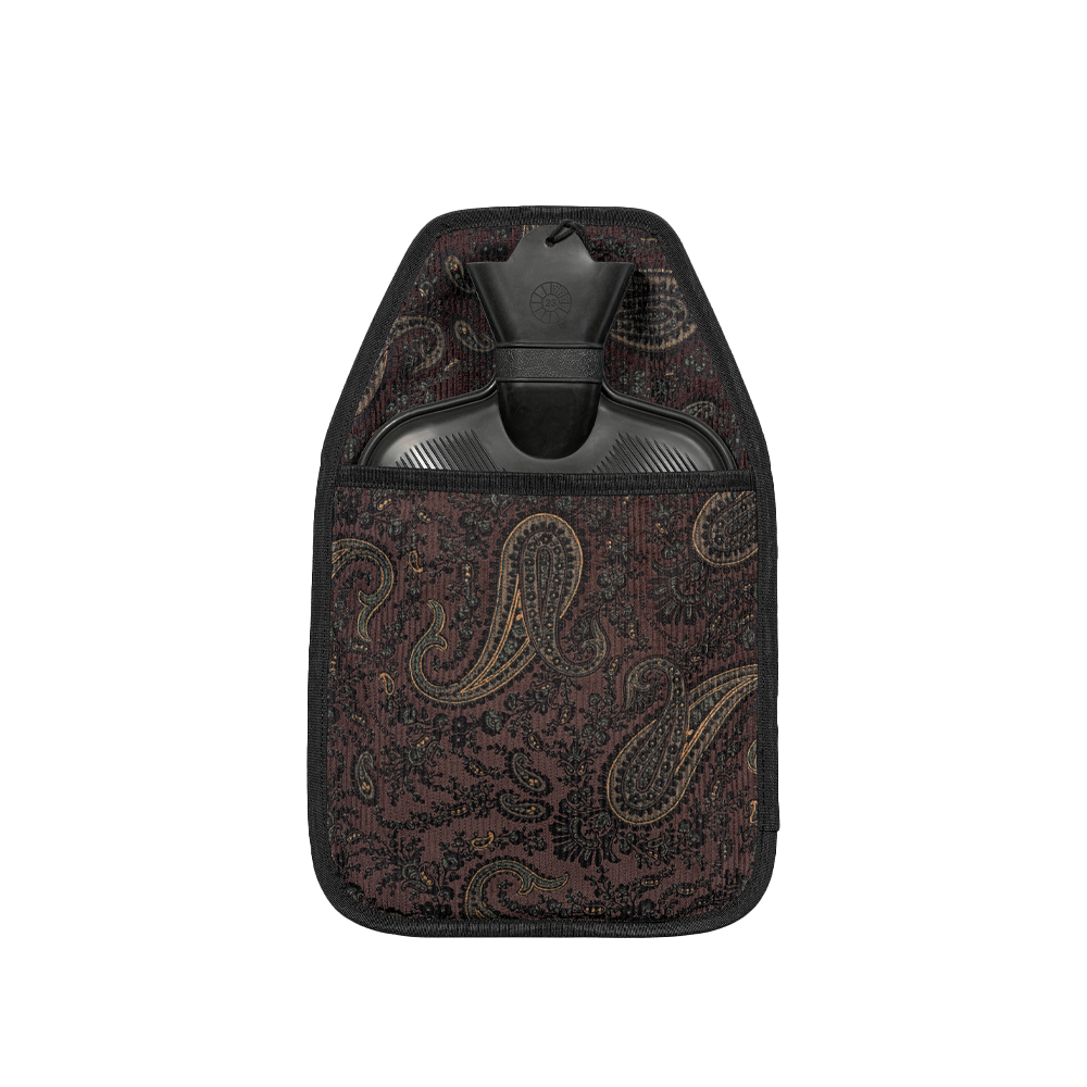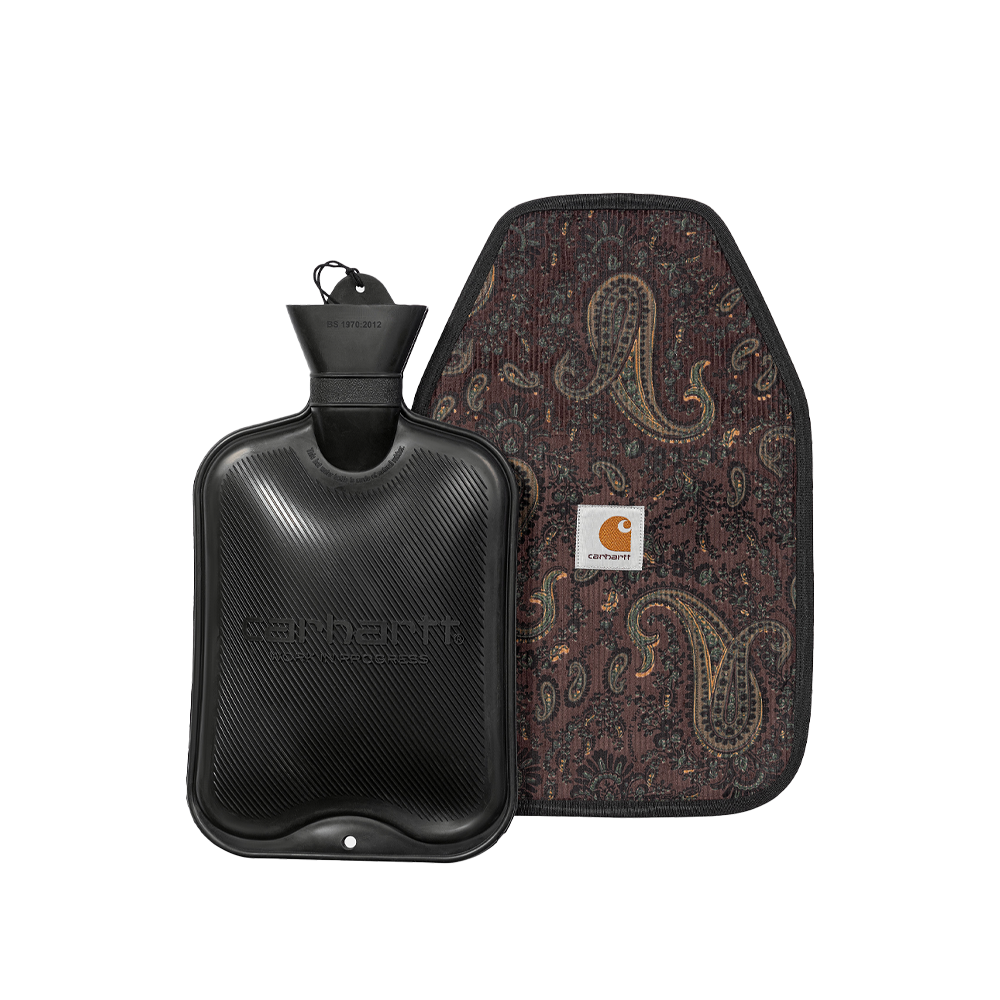 The Carhartt WIP Paisley Hot Water Bottle is made of rubber and has a screw-on closure. The bag is characterized by the logo embossed on one side and the “C” embossed on the other. It has a cotton velvet lining and features an allover seasonal cashmere pattern and a square fabric label.