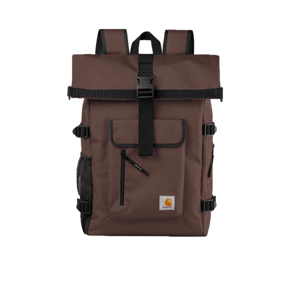 The Carhartt WIP Philis Backpack is an expandable style constructed from water-repellent, recycled polyester canvas. It features an unlined main compartment with a zip and flap closure, a padded inside pocket, and adjustable shoulder straps.