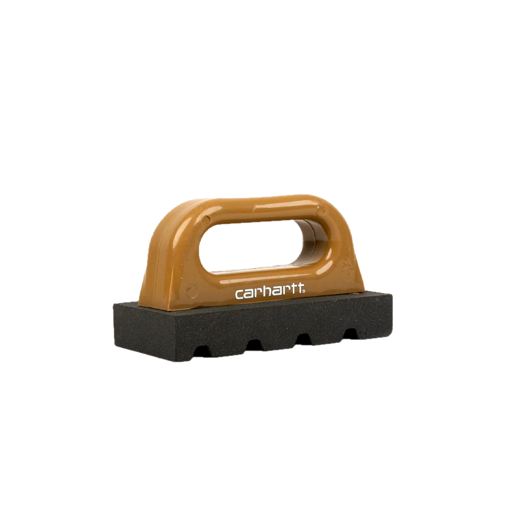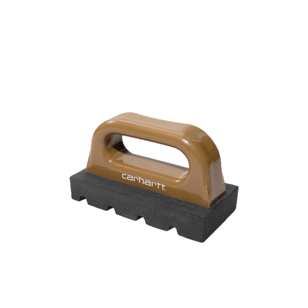 The Skate Rub Brick Tool is made of 120-grit silicon carbide, ideal for smoothing concrete, and features a plastic handle. It comes in an exclusive colorway and is embellished with the Carhartt WIP logo.