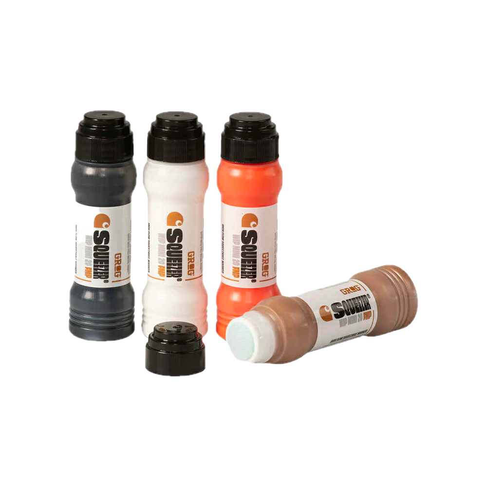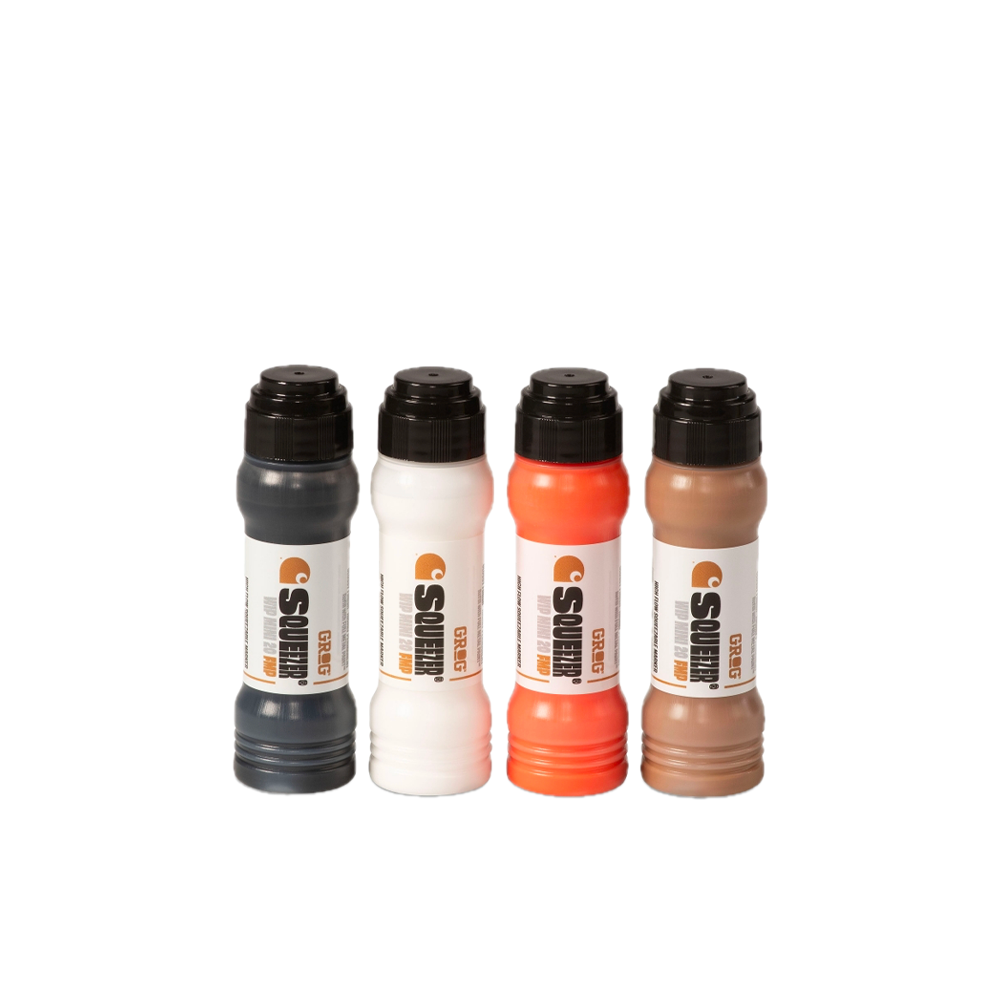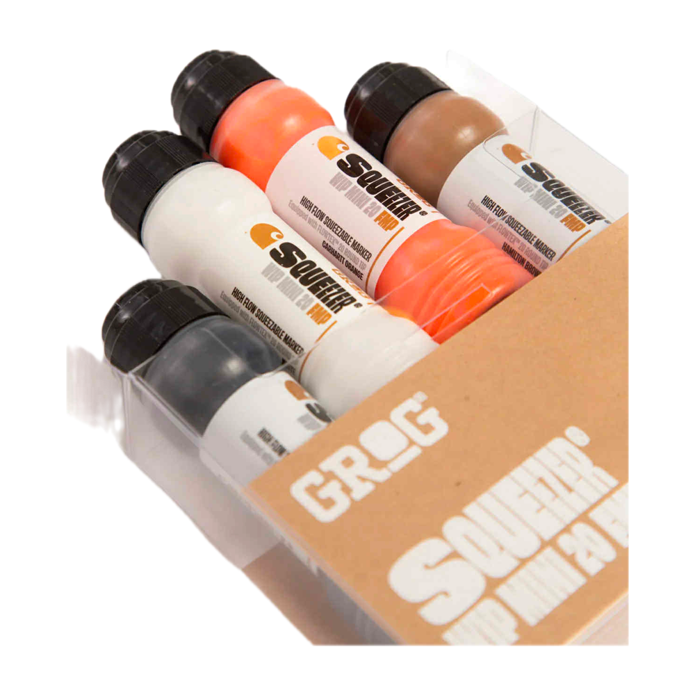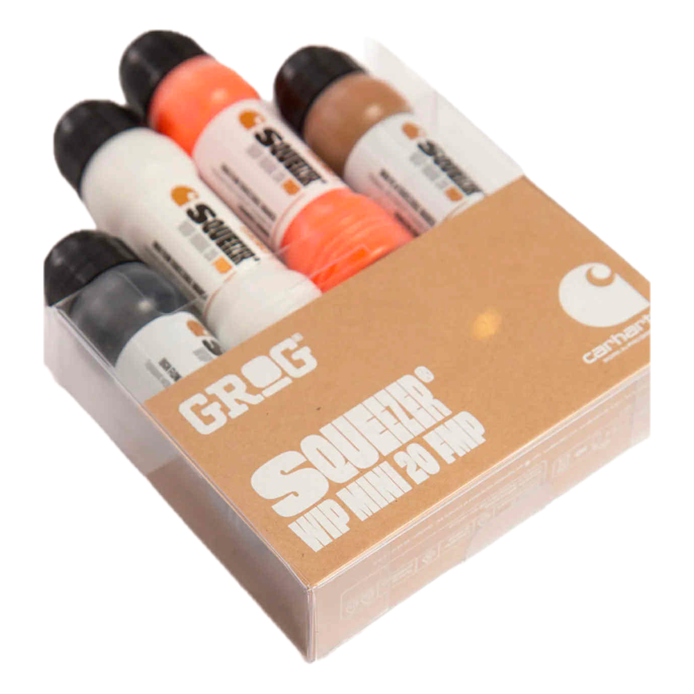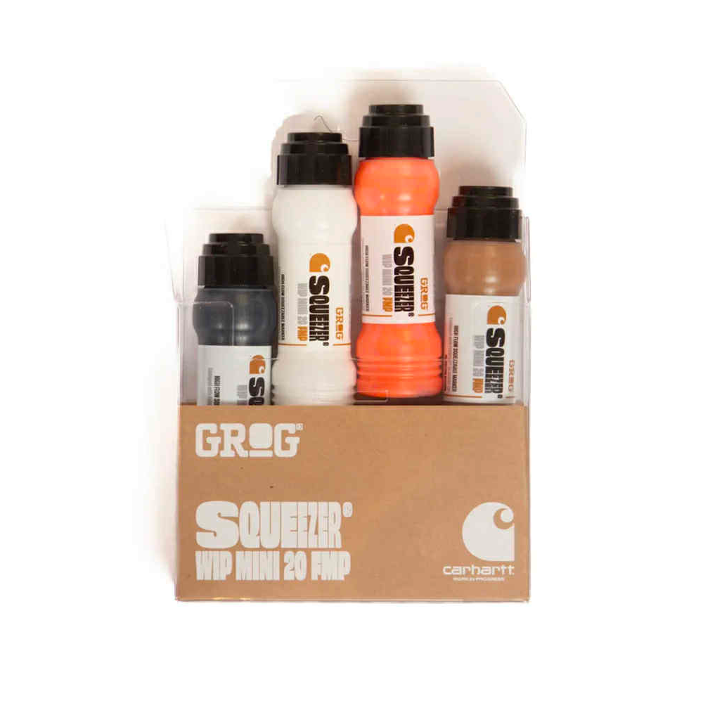 Il set Grog For Carhartt WIP Mini 20 Squeezer è realizzato in collaborazione con Grog, un marchio italiano che dal 2005 produce artigianalmente pennarelli a inchiostro e colori in una vasta gamma di finiture. Il set include quattro pennarelli con corpo morbido, nei colori nero, arancione Carhartt, marrone Hamilton e bianco. L’inchiostro è a base di alcol, garantendo una copertura opaca ad asciugatura rapida su tutte le superfici. Le penne possono essere ricaricate tramite le loro punte Flowtex.