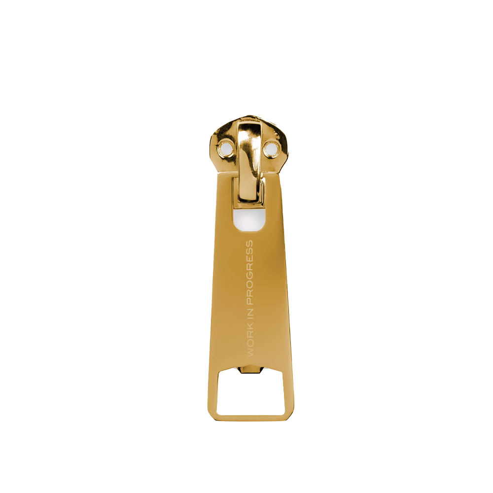 The Carhartt Zip Bottle Opener is made of gold-plated stainless steel in the shape of the classic Carhartt WIP zip slider. The bottle opener consists of two elements: a wall bracket and the actual bottle opener. The logo is engraved on the front and on the bottom.