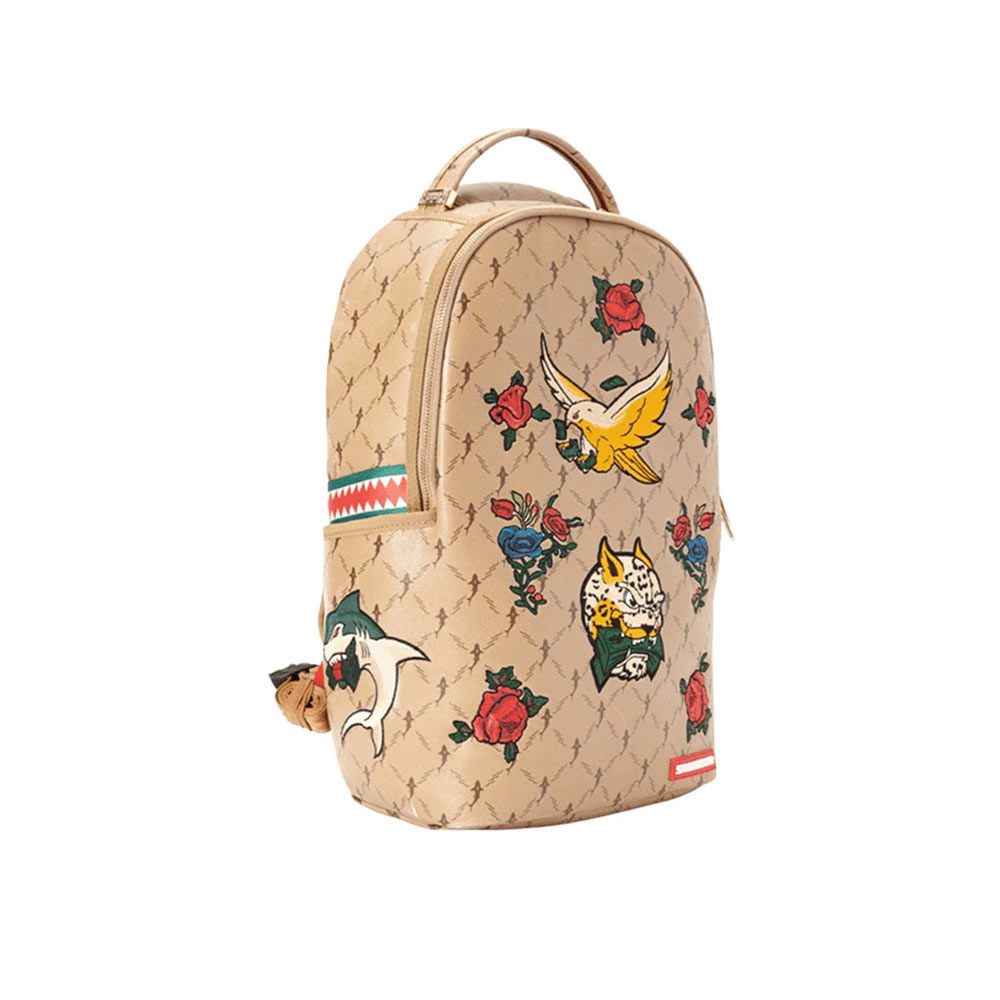 Zaino Sprayground in cuoio con decorazioni su tutti i lati.