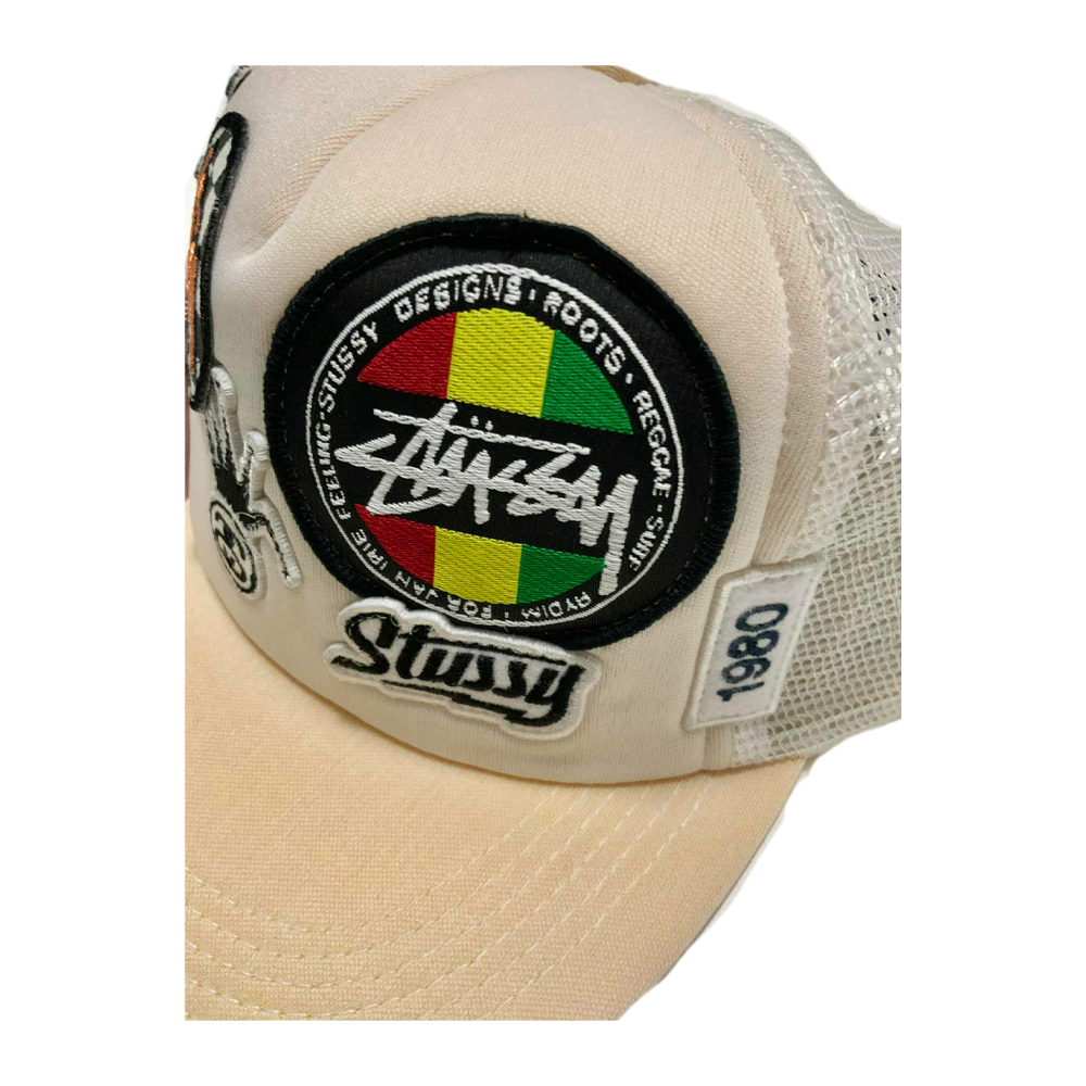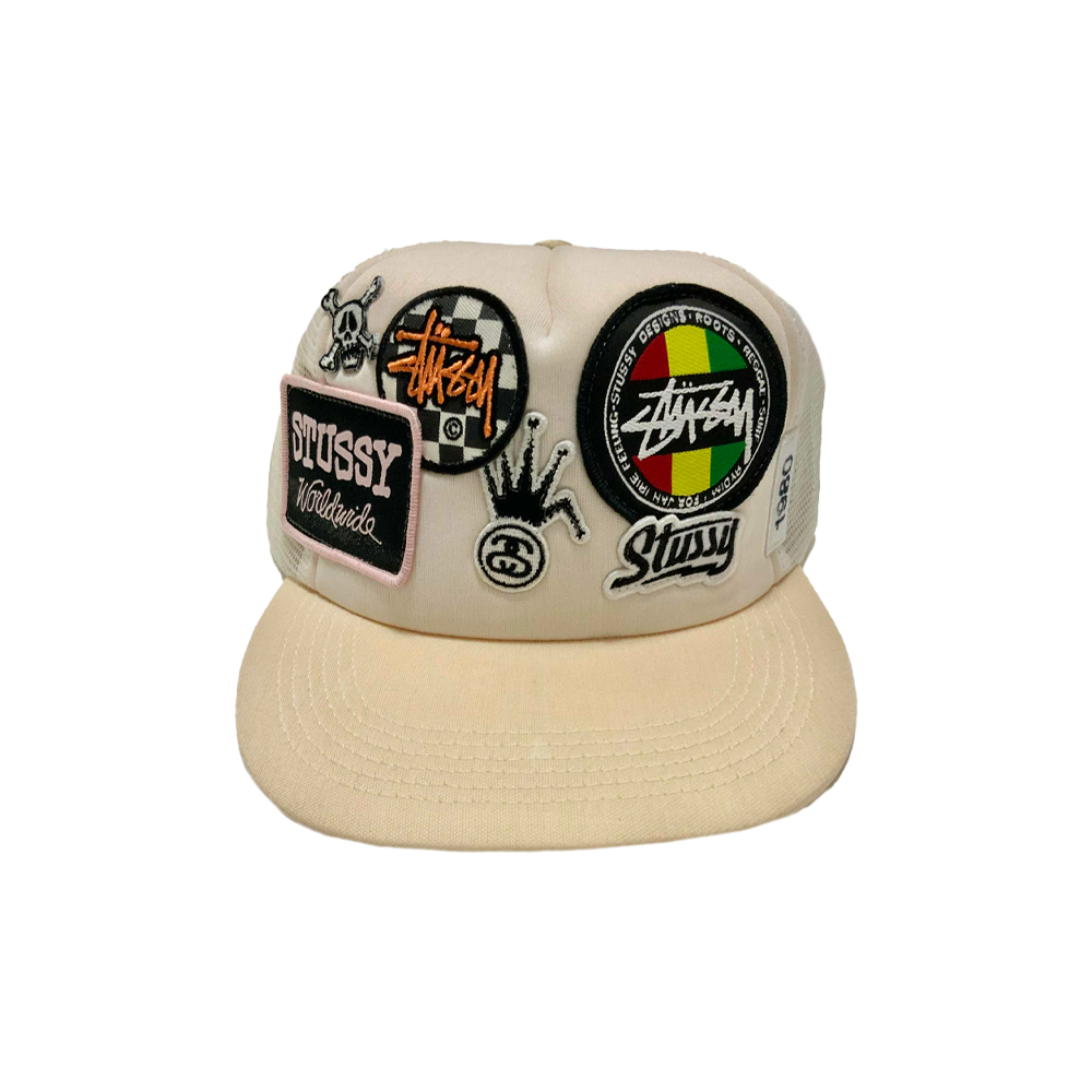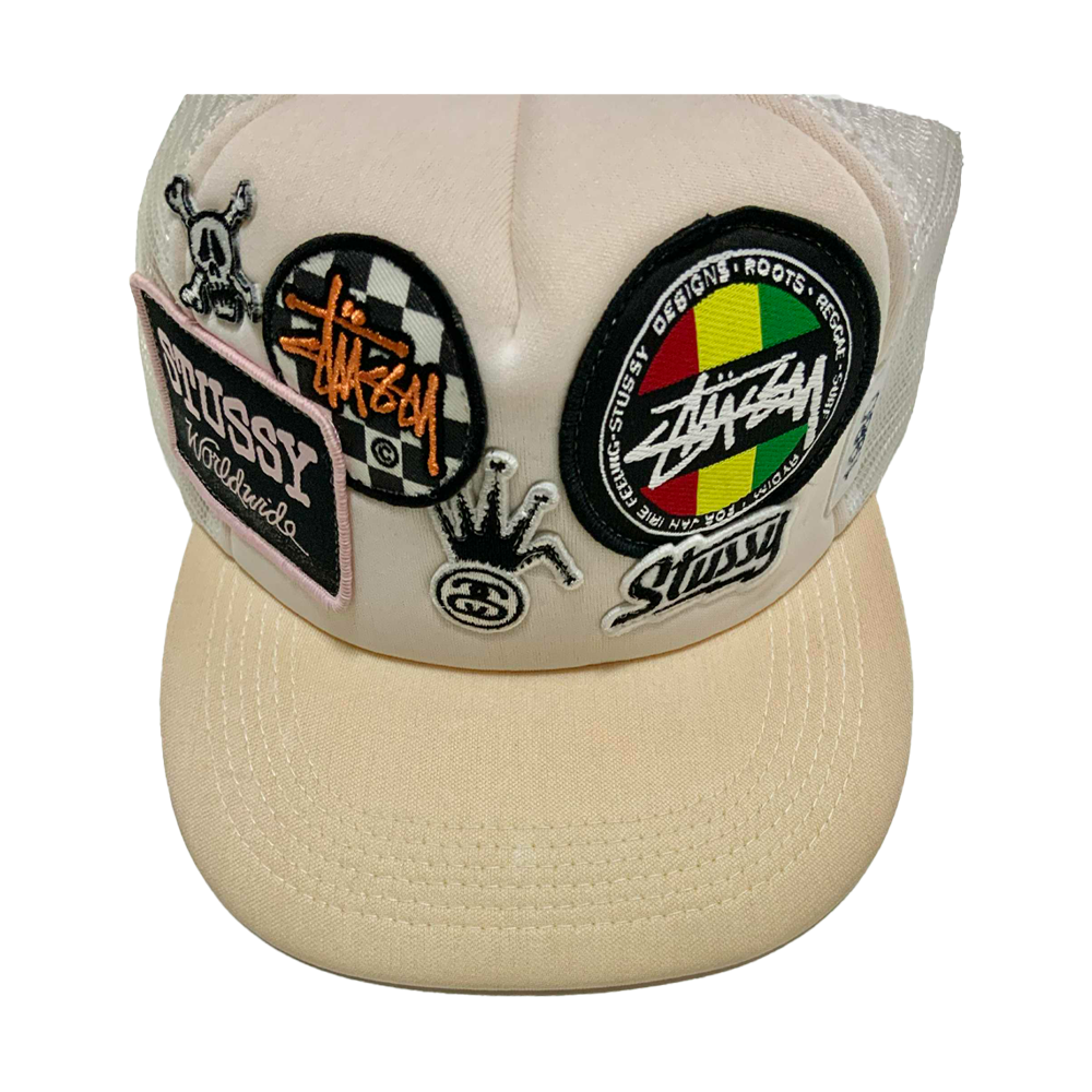 Cappellino Stussy Crown Logo Patches All Logo Trucker Hat, un pezzo rarissimo dei primi anni 2000, caratterizzato da patch e loghi Stussy applicati su tutta la struttura, pannello frontale rigido e retro in mesh in perfetto stile trucker, diventato oggi un oggetto da collezione ricercatissimo dagli appassionati dello streetwear vintage. il cappellino ha purtroppo perso parte del colore originale (bianco) a causa dell’usura del tempo.
