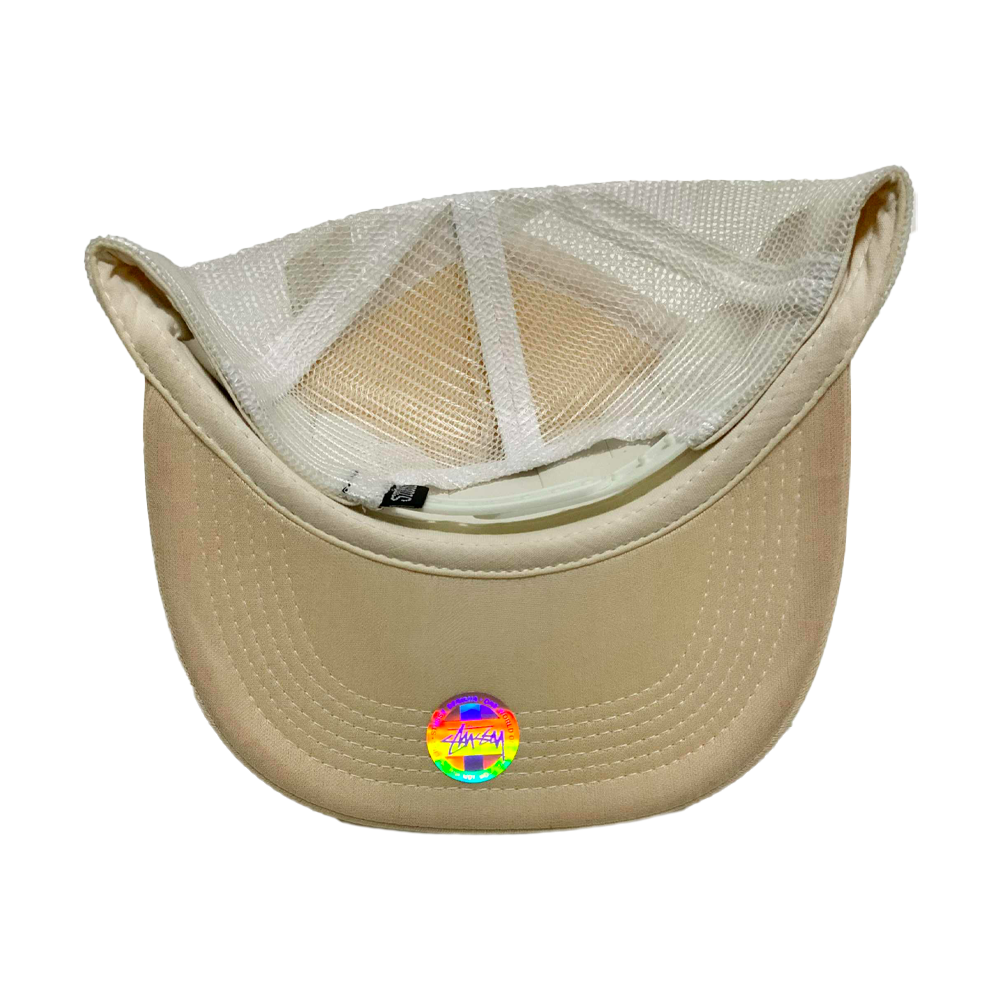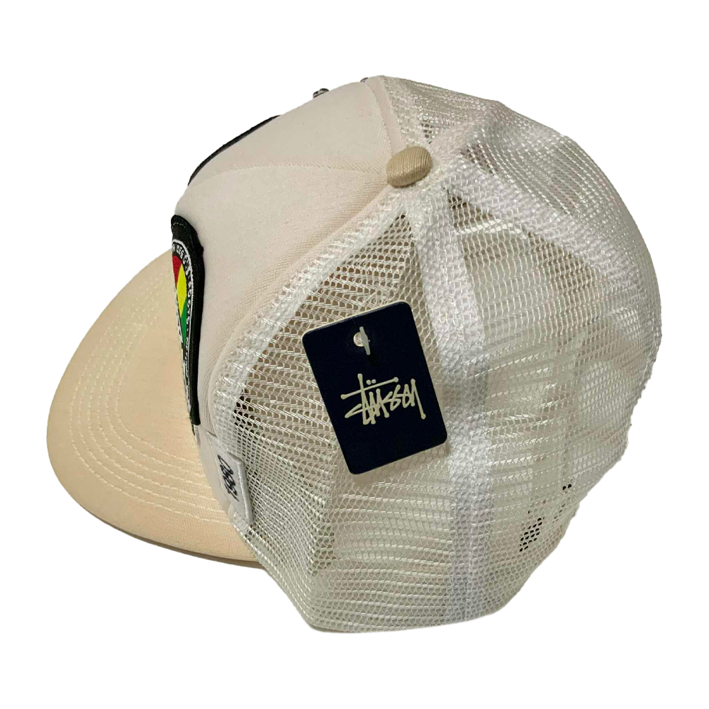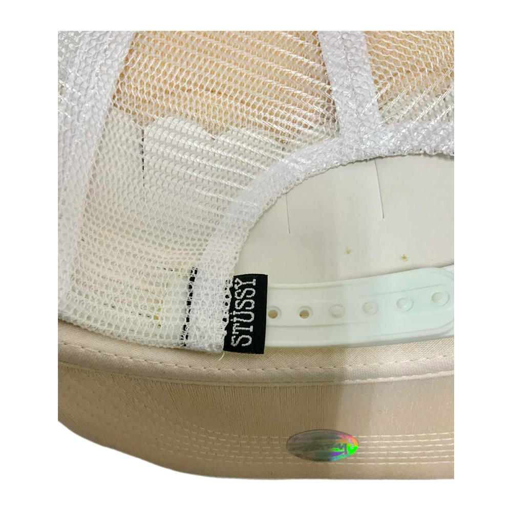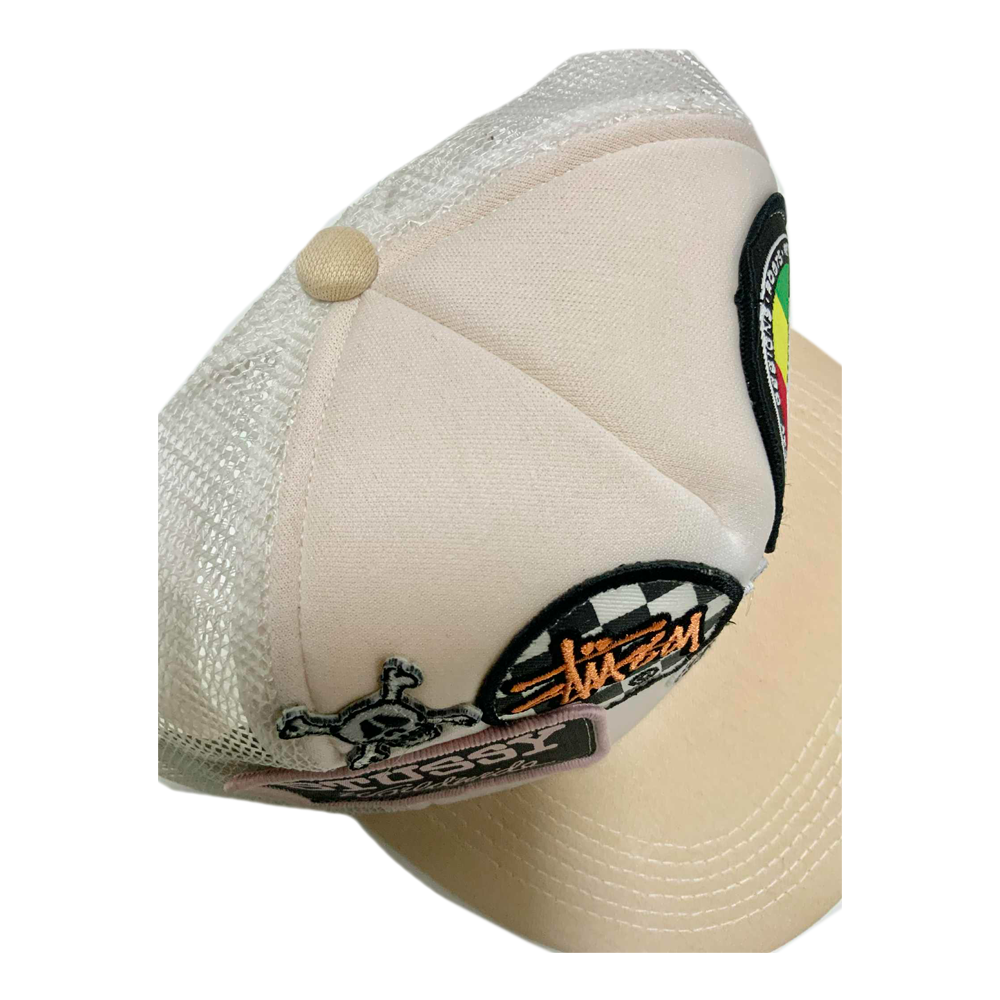 Cappellino Stussy Crown Logo Patches All Logo Trucker Hat, un pezzo rarissimo dei primi anni 2000, caratterizzato da patch e loghi Stussy applicati su tutta la struttura, pannello frontale rigido e retro in mesh in perfetto stile trucker, diventato oggi un oggetto da collezione ricercatissimo dagli appassionati dello streetwear vintage. il cappellino ha purtroppo perso parte del colore originale (bianco) a causa dell’usura del tempo.