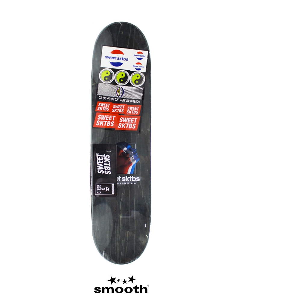 Skateboard prodotto dalla ditta Sweet Sktbs, la tavola presenta nel retro una stampa serigrafica. Di fronte la stessa stampa del retro ma in versione più piccola, il logo del brand di colore bianco e la scritta ‘Estabilished Ninetynine’.