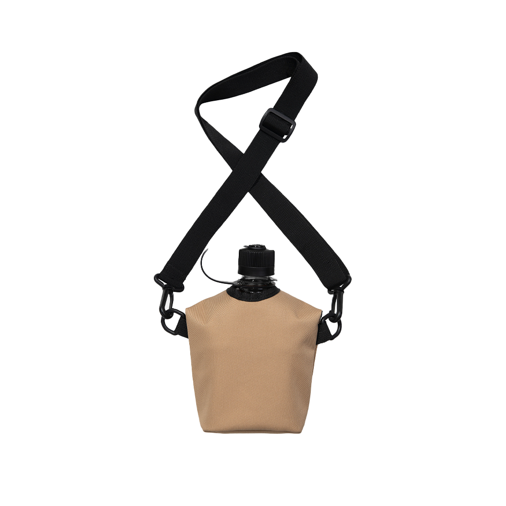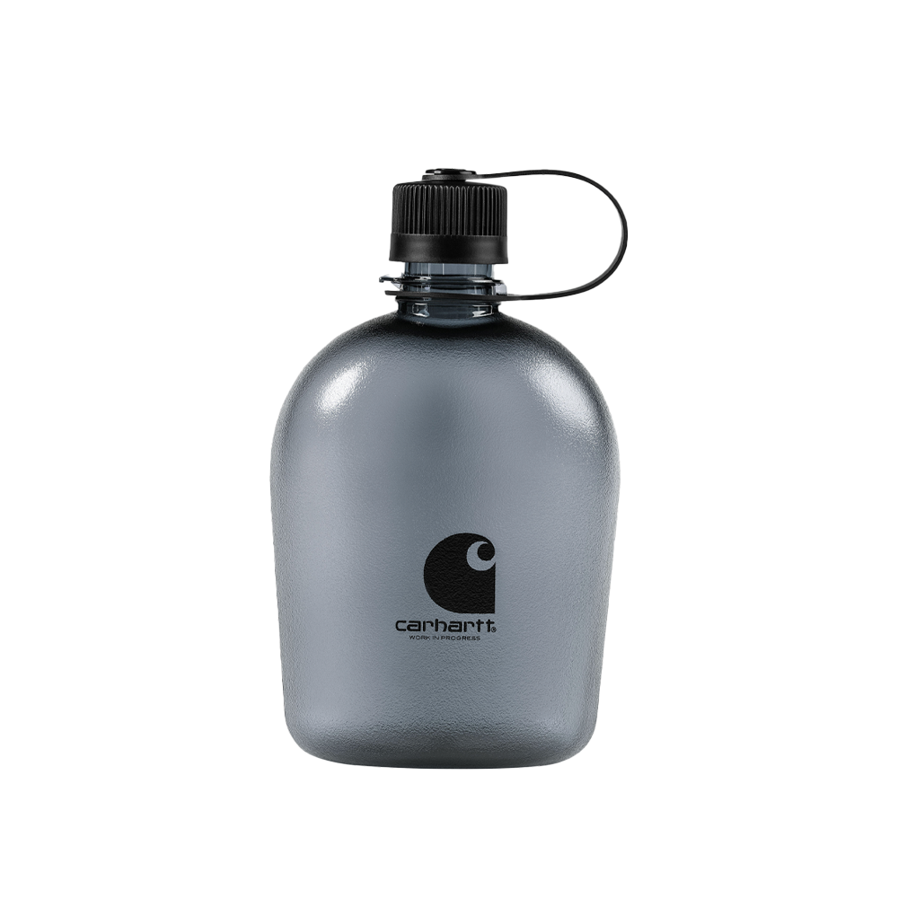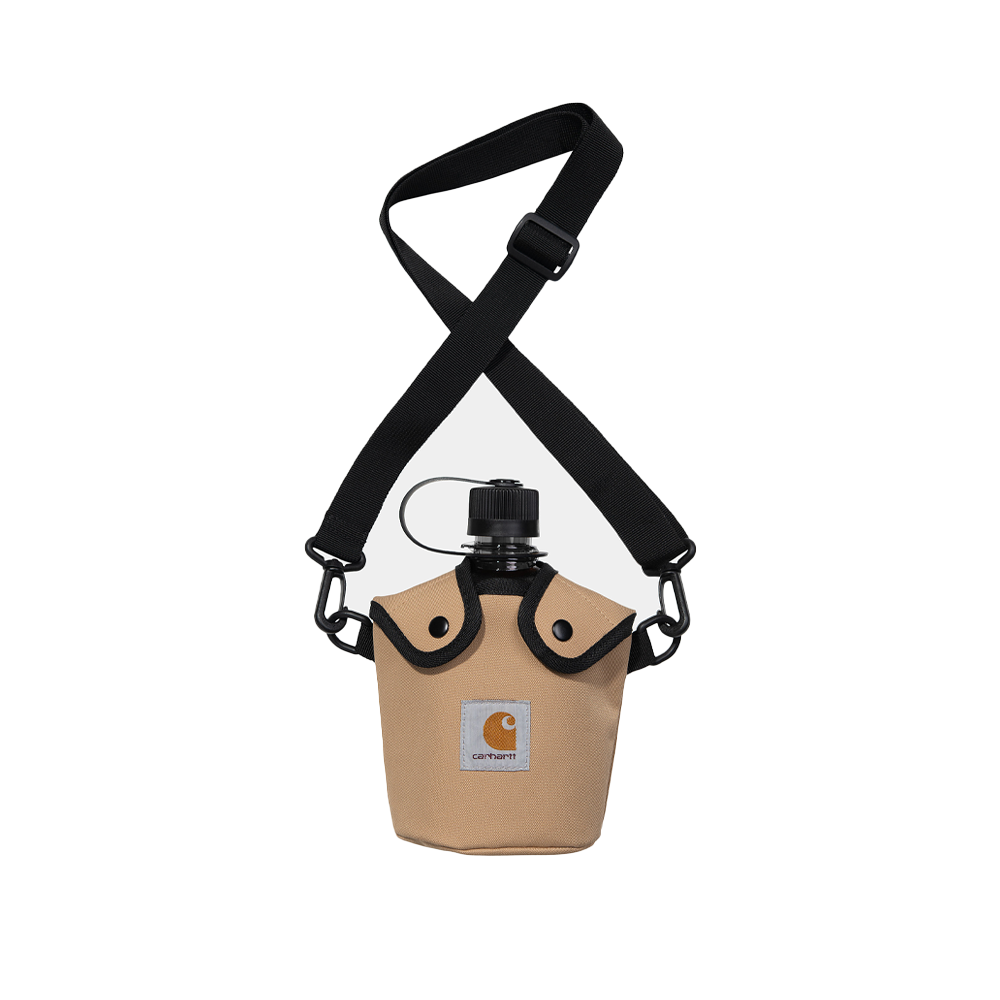 The Carhartt WIP Field Bottle comprises a carry bag made of recycled polyester canvas and a bottle made of BPA-free Eastman Tritan™ Copolyester. The bag is unlined and features two front flaps with a snap-button closure, as well as an adjustable shoulder strap. The bottle has a screw-on top with a loop and is detailed with a graphic print. It is also dishwasher safe. A woven Square Label on the carry bag completes the design.