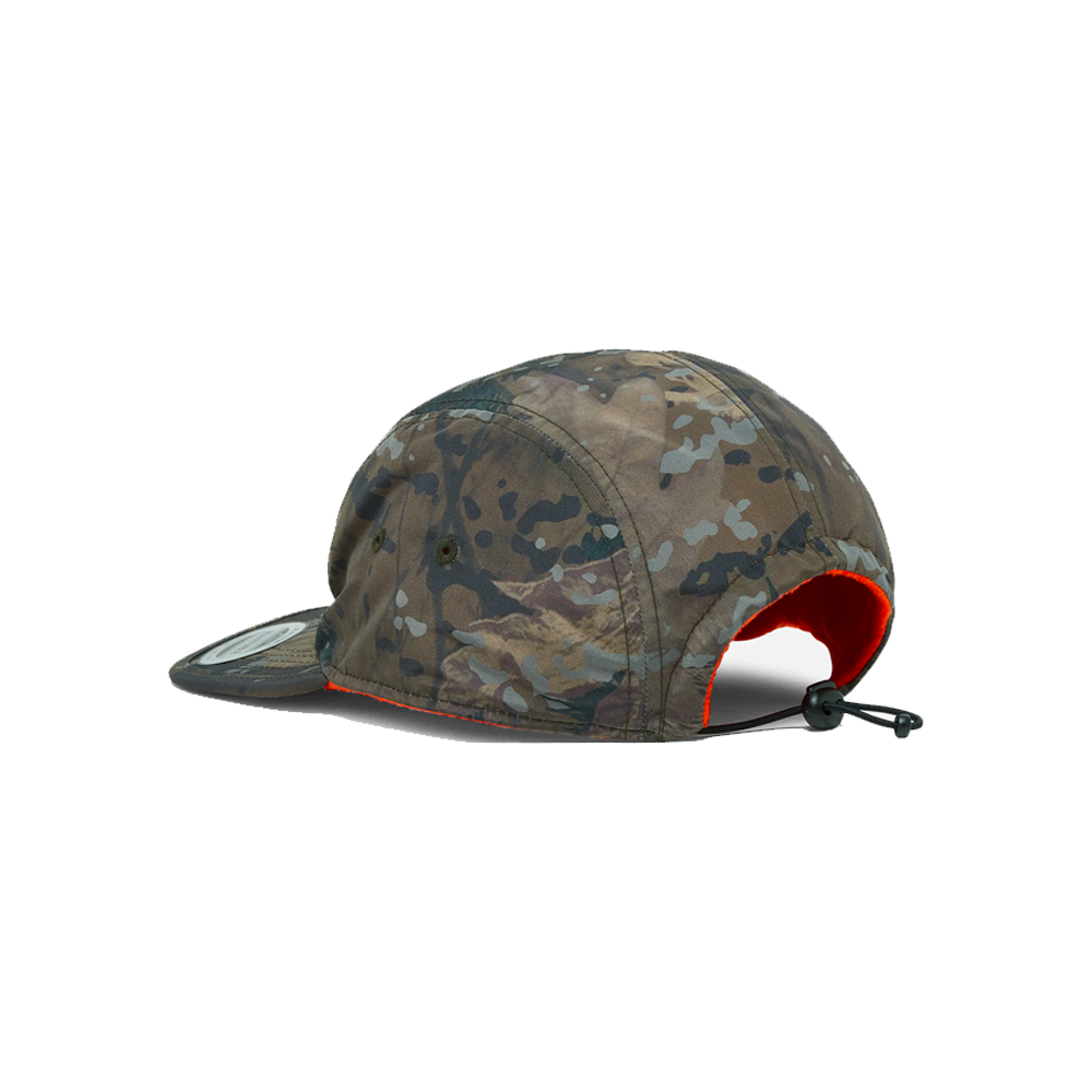 Carhartt WIP reversible 5-panel cap with drawstring, camouflage polyester side with logo and fleece side with front square label..