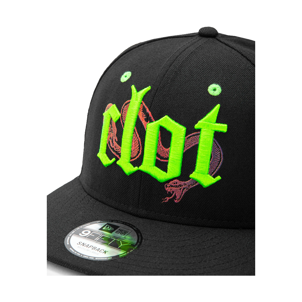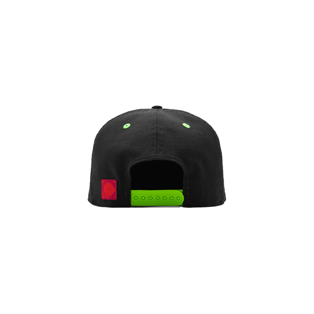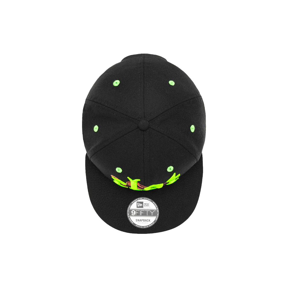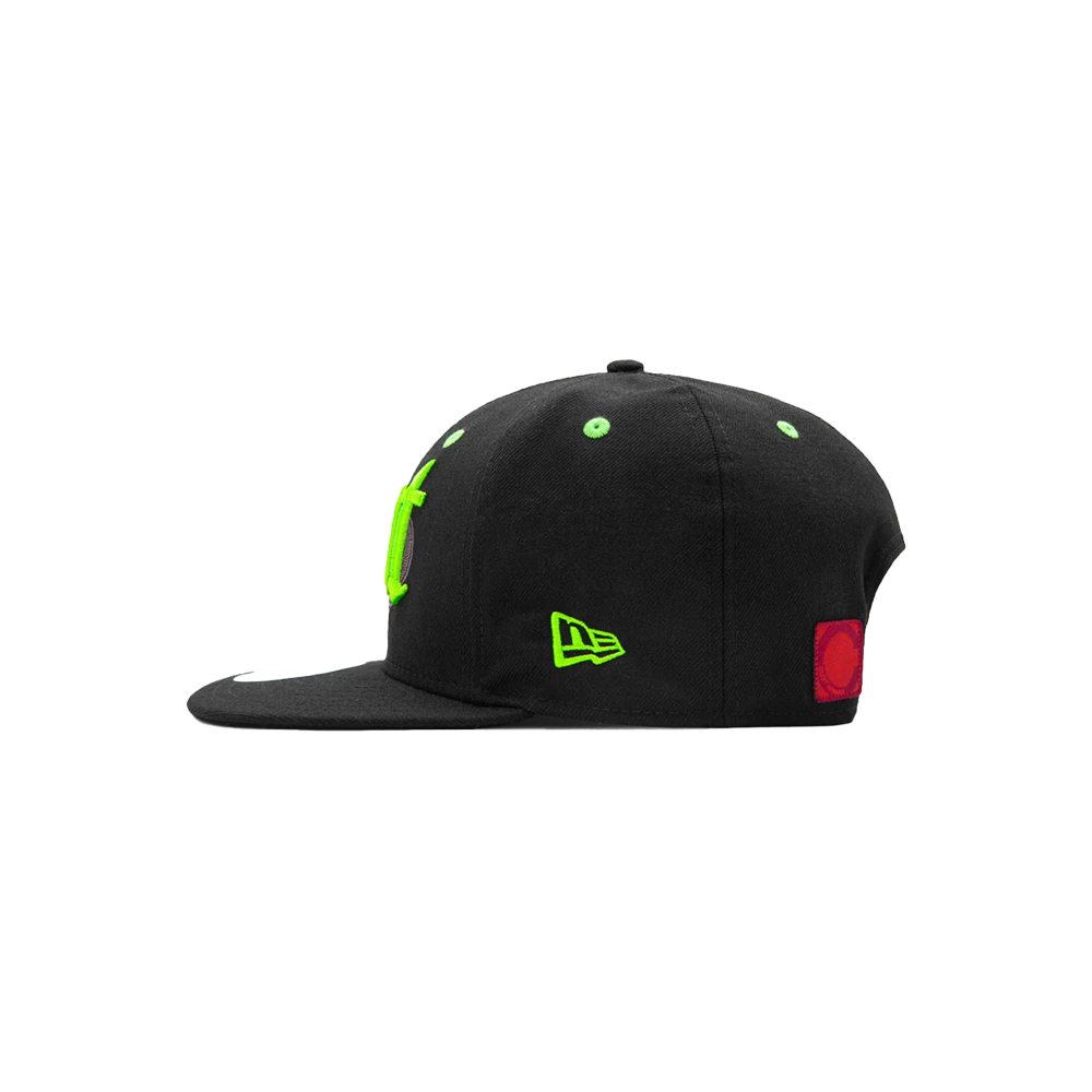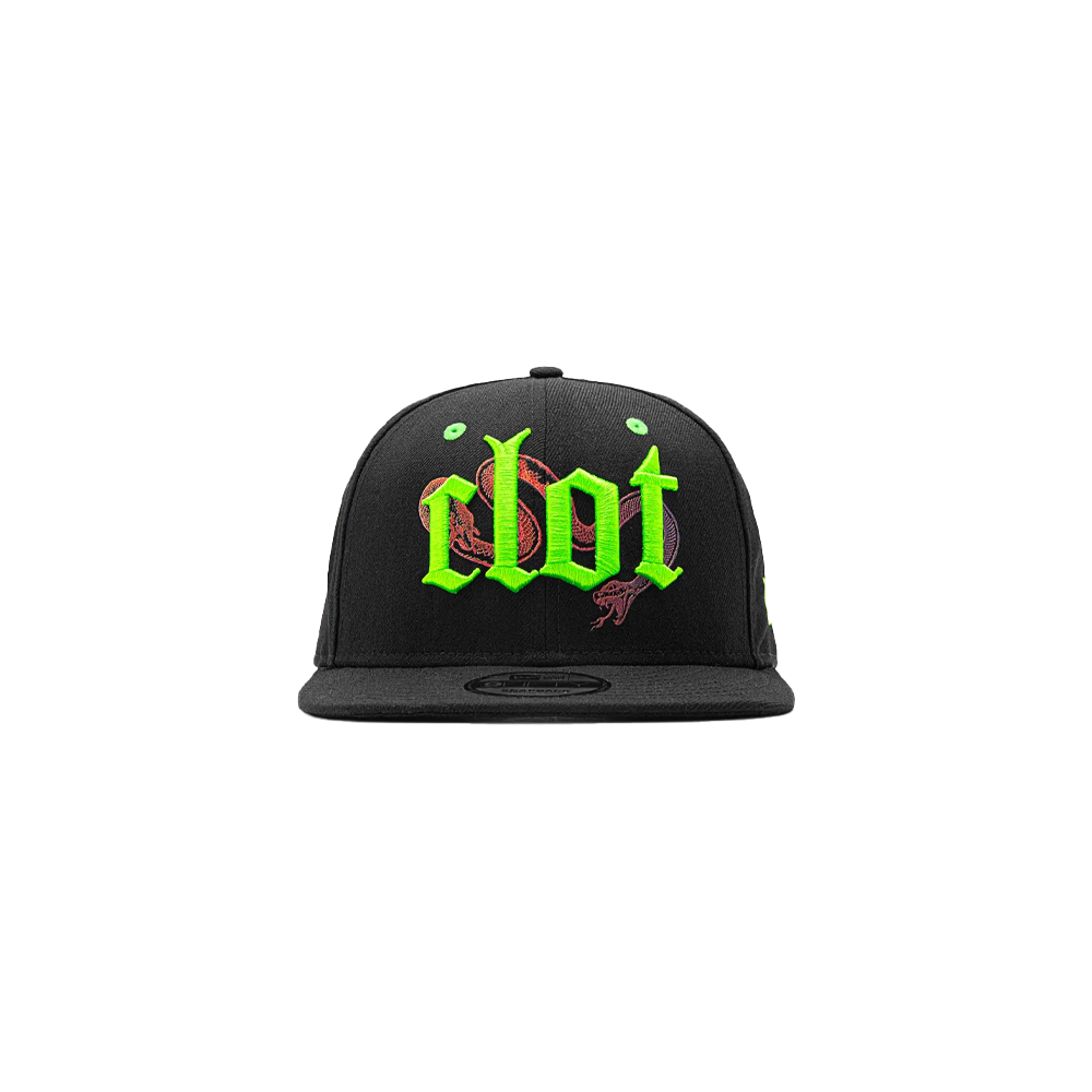 This cap by CLOT is adjustable and features the ‘CLOT’ logo in gothic font branding with a graphic snake motif in gradient hues.