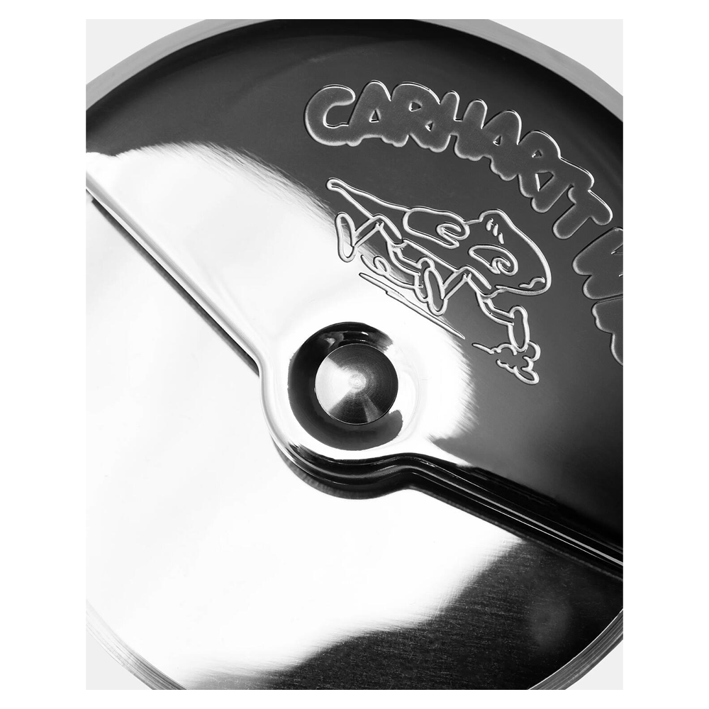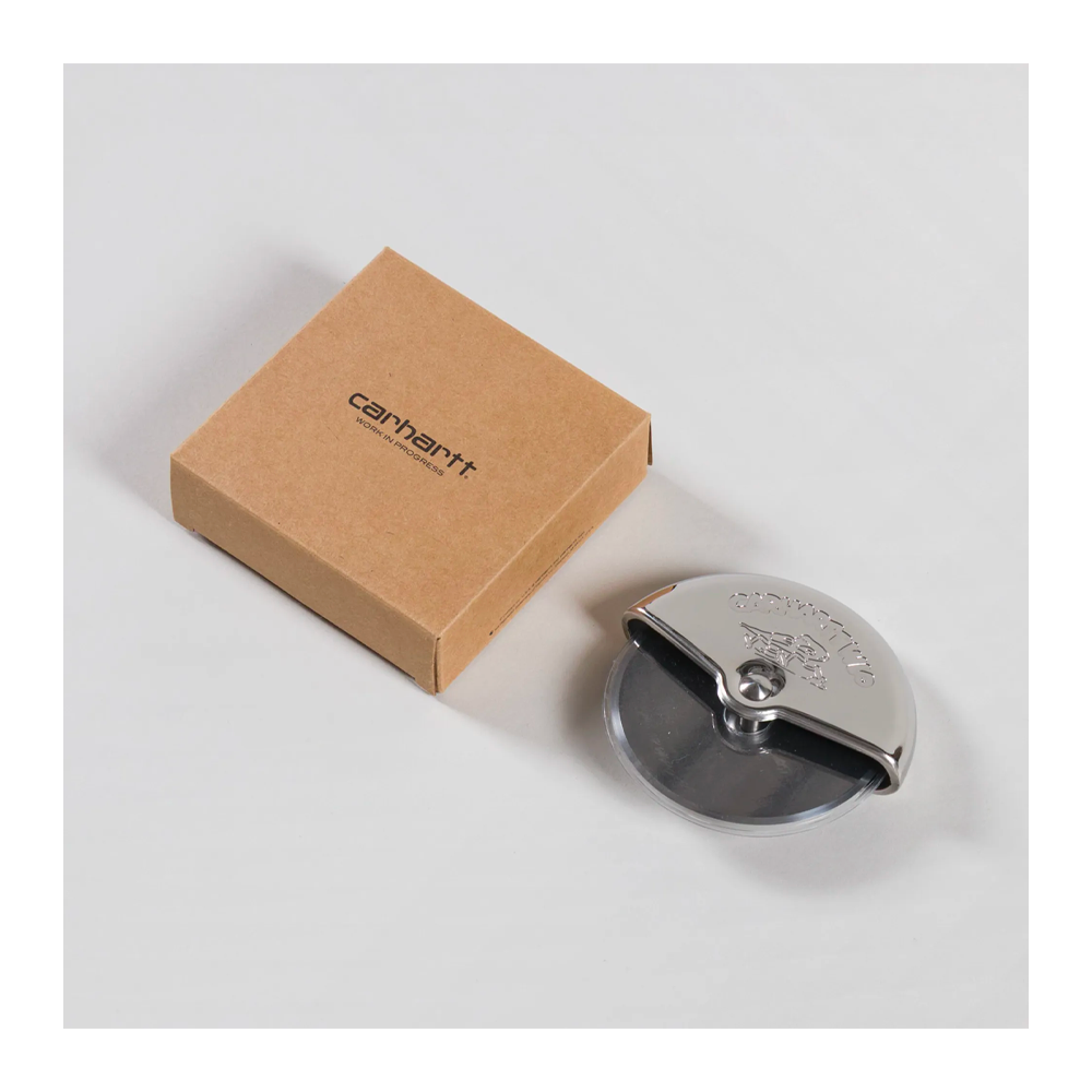 Sharp 304 stainless steel kitchen accessory with a satin finish and graphic engraving on both sides of the handle. Featuring an extremely sharp rotating blade, it is designed for slicing with precision and style. Dishwasher-safe, it combines functionality and graphic design in true Carhartt WIP style. A compact and sturdy object, use with caution.