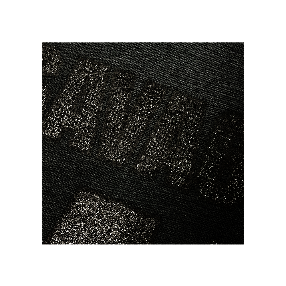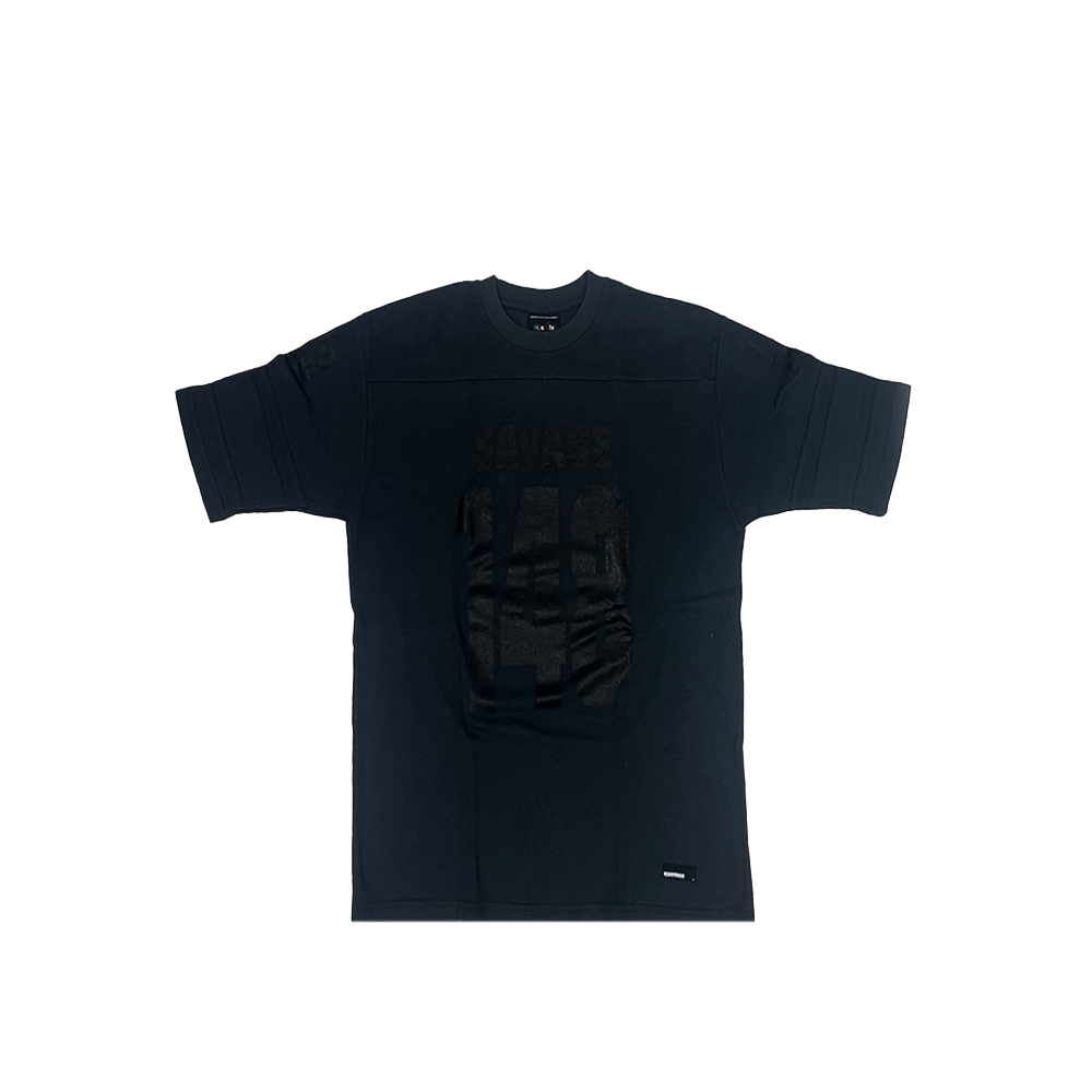 Inspired by the aesthetic of American football jerseys, the “Savage 149” t-shirt by Neighborhood combines sportiness and sobriety in a streetwear piece in all-black tones. The front graphic, with the wording “SAVAGE” and the number “149” in jersey style, is printed in relief with a shiny tone-on-tone effect on a matte black cotton base, for a technical and sophisticated look. The same print is also reproduced entirely on the back, creating symmetry and visual continuity. The sleeves are enriched with horizontal stitching that recalls the panels of game jerseys, while a black patch with the Neighborhood Technical Apparel logo is sewn onto the front bottom. Inside, the label with the “sm1x” logo and the progression of the years highlights the 2004 vintage, when the piece was presumably produced. Regular fit, with technical details and solid construction that testify to the artisanal attention of the Japanese brand.