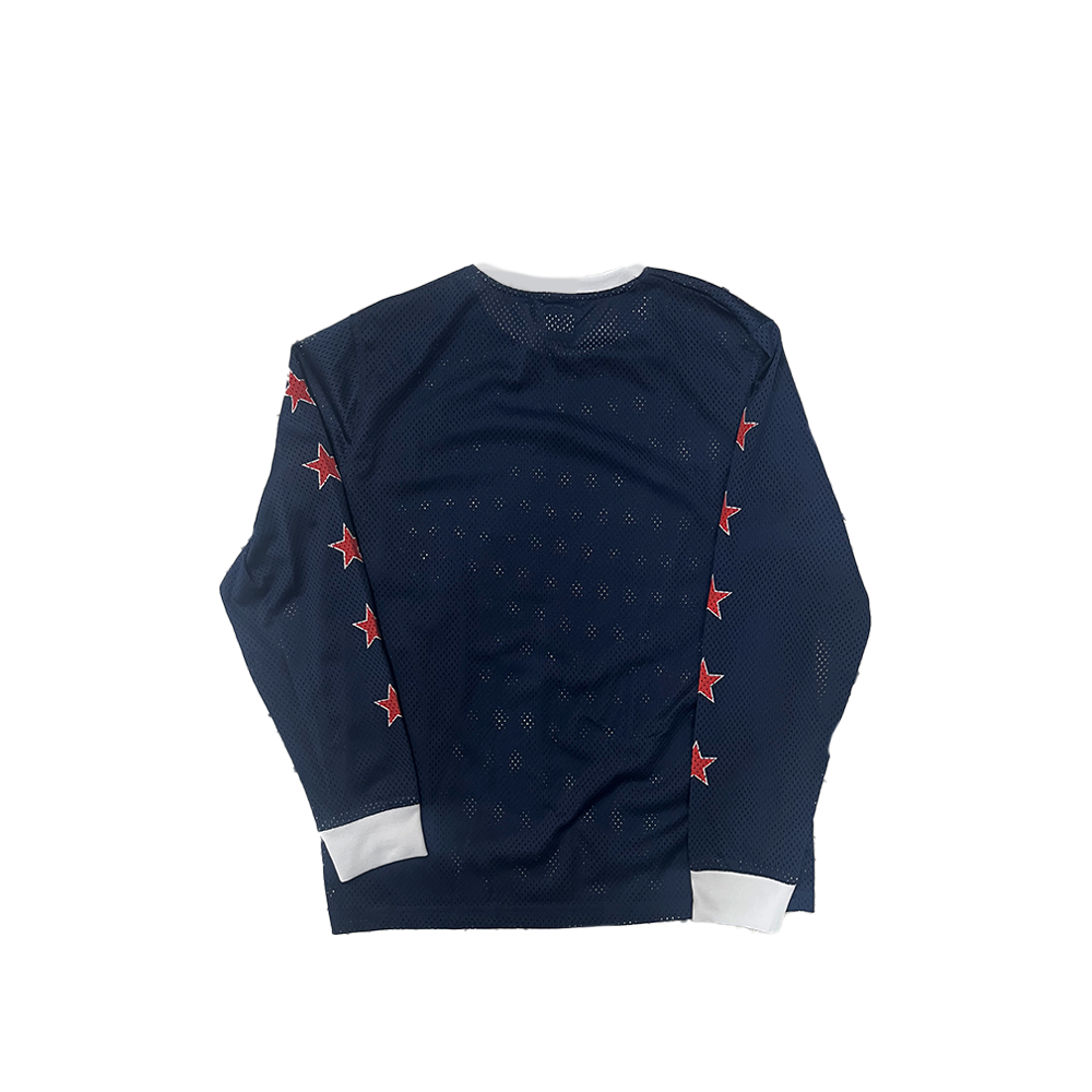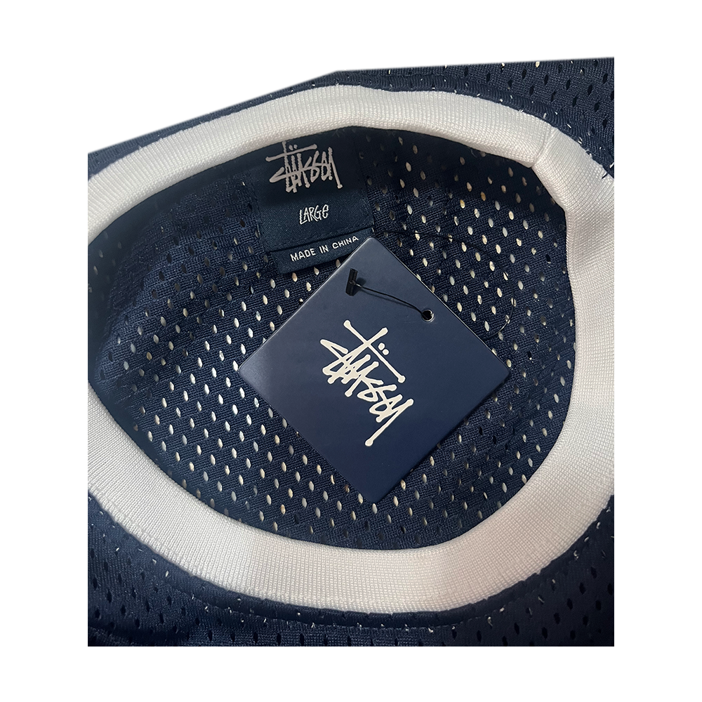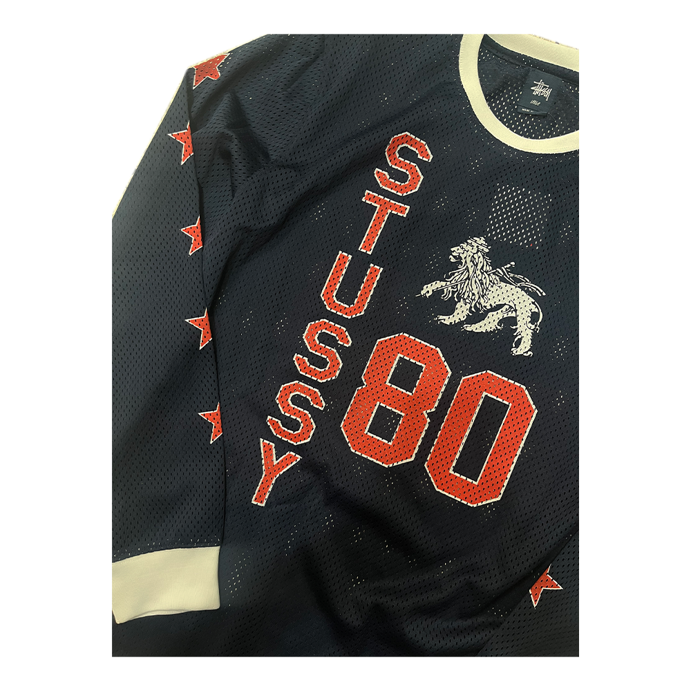 Maglia in rete ispirata al football americano firmata Stussy, dal forte impatto visivo e dal sapore sportivo-retro. Il modello presenta un corpo in mesh traforato di colore blu navy scuro con dettagli bianchi e rossi. Sul petto campeggiano il logo “STUSSY” stampato verticalmente, un leone araldico e il numero “80”, elemento ricorrente nei riferimenti vintage del brand. Le maniche sono impreziosite da una serie di stelle rosse, mentre i bordi a costina bianchi su collo e polsini creano un contrasto deciso. Fit regolare, perfetto per essere indossato anche come pezzo statement sopra ad altre maglie. Taglia disponibile: L.