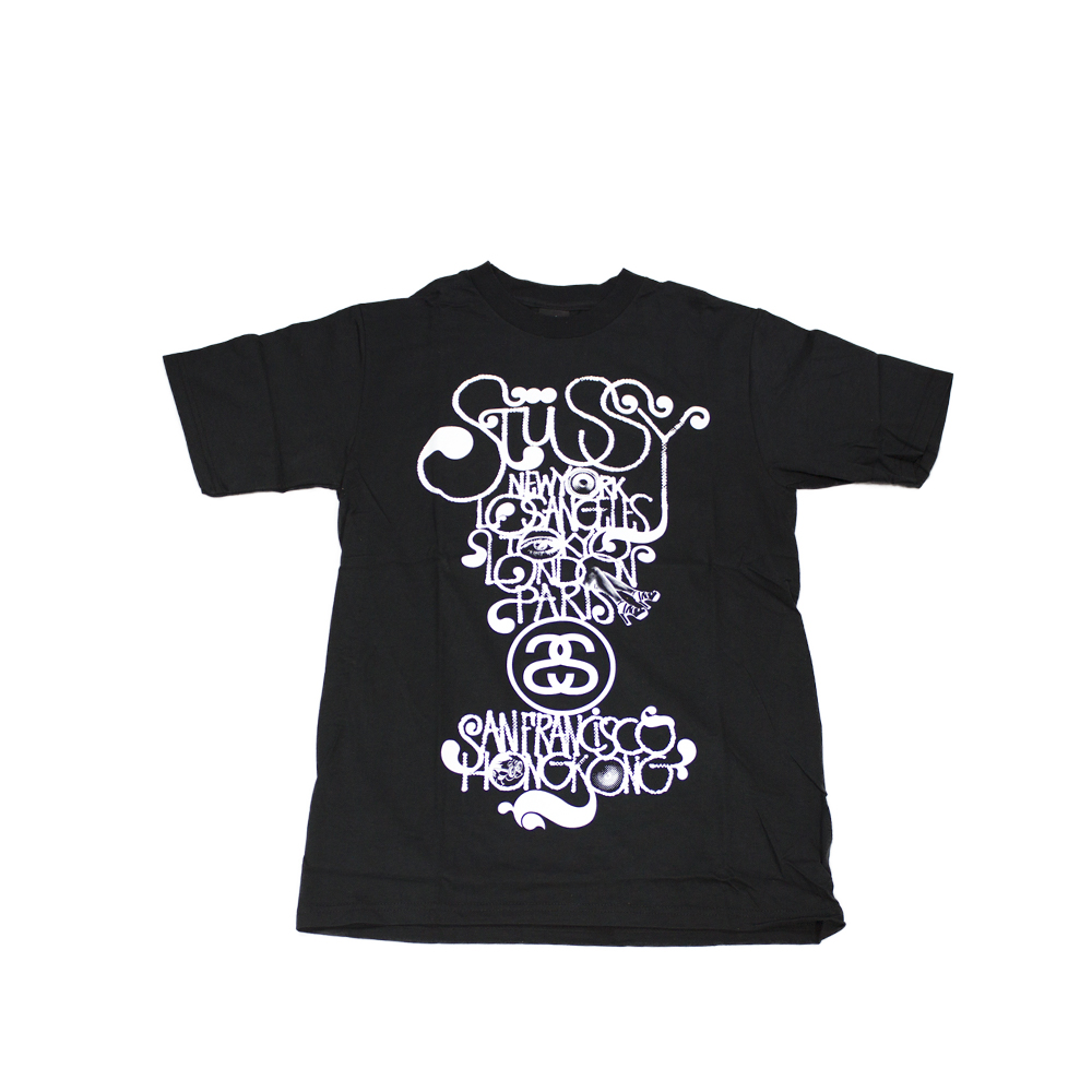 L’autunno del 1989 è stato ricordato per la prima uscita della t-shirt Stussy World Tour. Shawn Stussy ha creato quello che sarebbe diventato un concetto duraturo nel design grafico di t-shirt. L’idea e l’esecuzione erano semplici: accostare due culture di mondi tradizionalmente diversi – un dispositivo di stile che era stato usato nell’arte e nella musica. Sul davanti della maglietta, i nomi delle città associate ai giganti della moda e del glamour di fascia alta sono scritti in un tipo elicoidale stoico e formale. Londra, Parigi, Los Angeles, New York, Tokyo, queste erano le città considerate le capitali dello stile del mondo contemporaneo. La parte posteriore della maglietta era stampata con nomi di quartieri in cui il nostro tipo di cultura di strada era in realtà fiorente. Considerate oscure e sotterranee, queste aree urbane non sfruttate stavano per scuotere il mondo. Scarabocchiato in un manoscritto disegnato a mano, il retro della maglietta si scontra con la parte anteriore in stile, aspetto e significato. Il graffito è stato un grido per queste città: Brooklyn, Bronx, Compton, Santa Ana e Venezia, e sta nuovamente riprendendo una nuova atmosfera, direzione e atteggiamento.