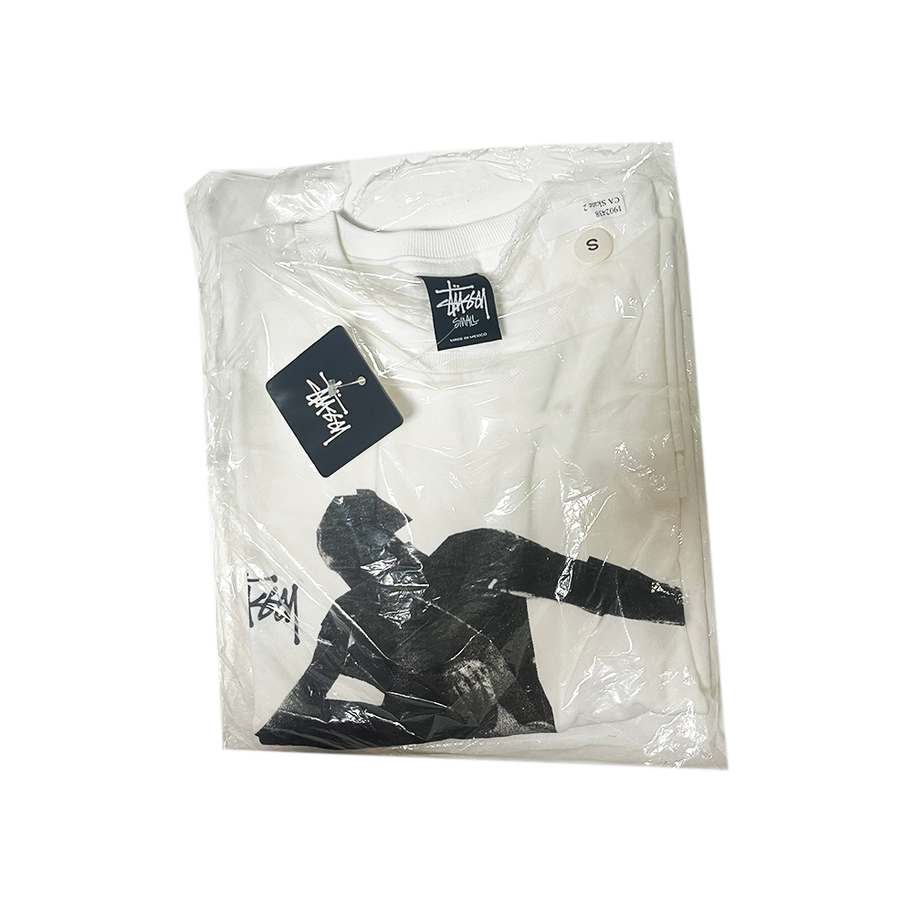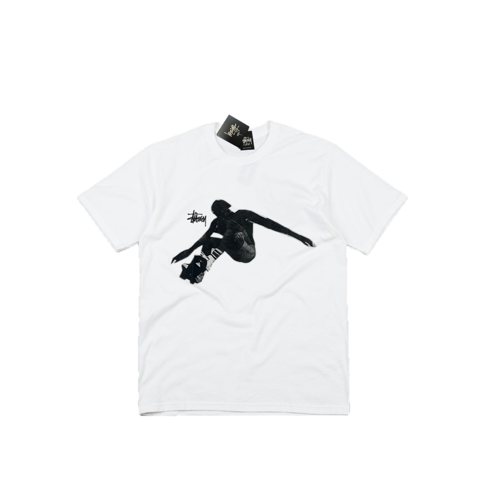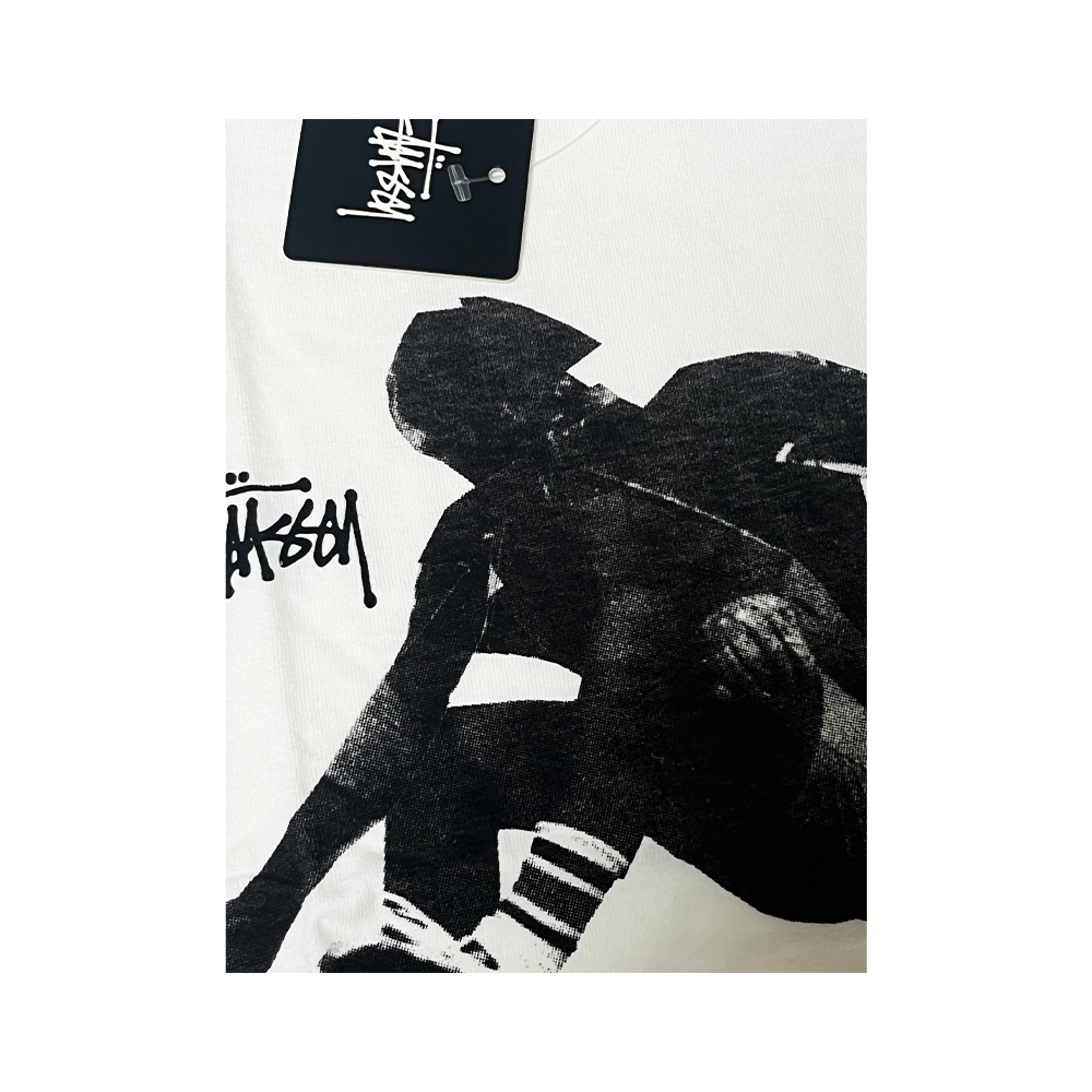 A tribute to the brand’s Californian skateboarding roots, the “CA Skate 2” tee by Stüssy captures the raw energy and motion of street culture. The front graphic features a black silhouette of a skater caught mid-air, frozen in a powerful pose with the board beneath their feet—evoking the iconic visuals of 1980s skate photography. The classic Stussy logo sits subtly beside the figure. Set on a clean white jersey, the stark contrast enhances the graphic’s impact. An archival piece, never worn, complete with original hang tag—ideal for skaters, collectors, and lovers of true streetwear history.