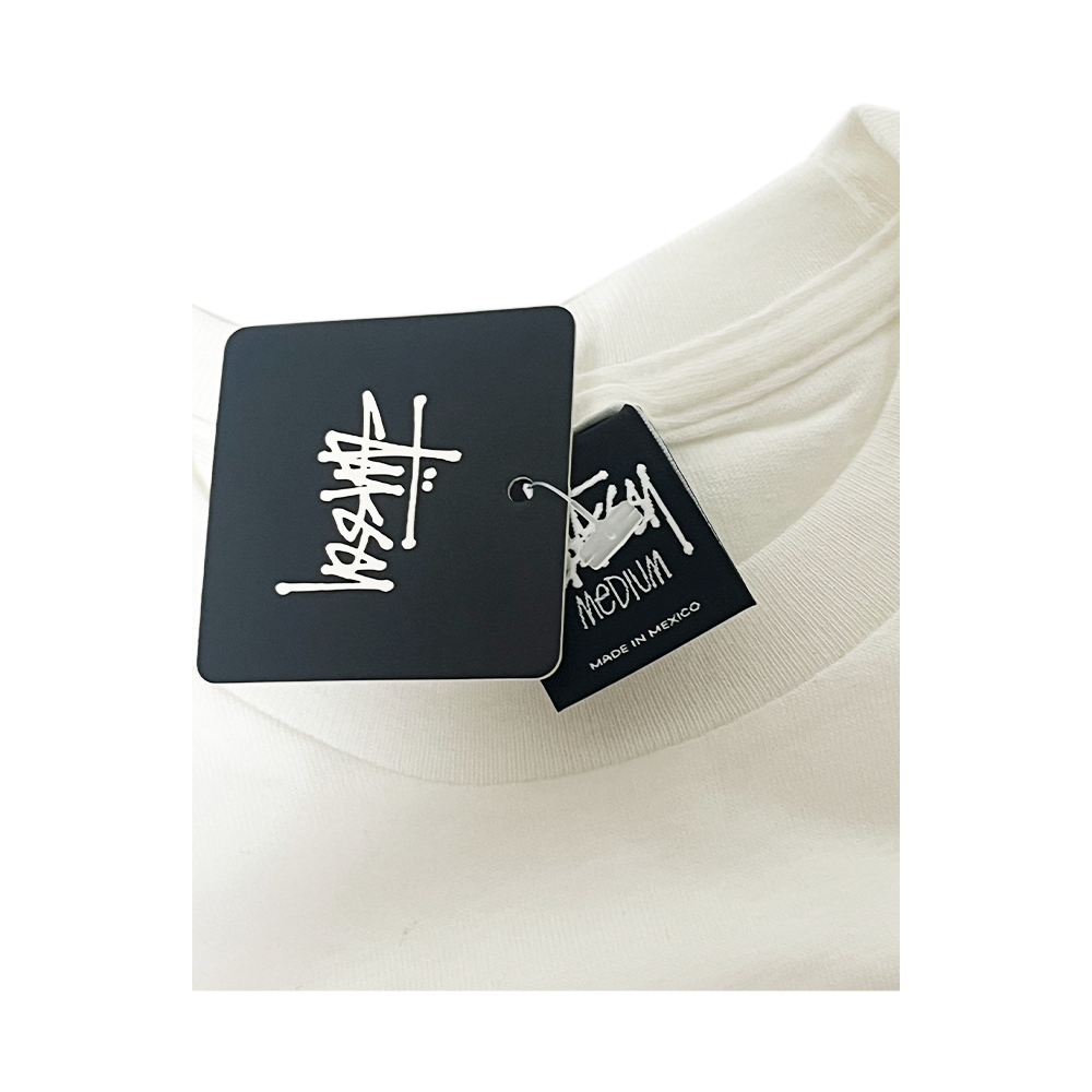 Un omaggio diretto alle radici skate californiane del brand, la t-shirt “CA Skate 2” di Stüssy cattura l’essenza cruda e dinamica della cultura street. La grafica mostra la silhouette nera di uno skater in piena evoluzione, sospeso nell’aria con la tavola sotto i piedi, immortalato in un gesto atletico che richiama le iconiche immagini degli anni ’80. Accanto alla figura, il logo Stussy in nero dona un tocco di autenticità discreta. Realizzata su jersey bianco, questa tee esalta la forza del contrasto visivo ed è perfetta per chi cerca uno stile minimale ma ricco di significato. Conservata in condizioni da archivio, completa di etichetta originale.