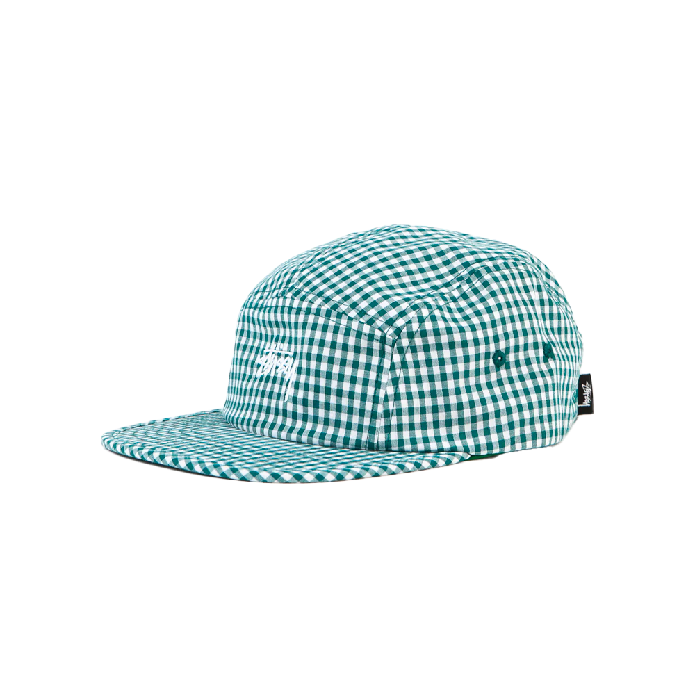 Stussy 5-panel all-cotton camping hat with green embroidered checks. Webbing waistband on the back and woven labels.
