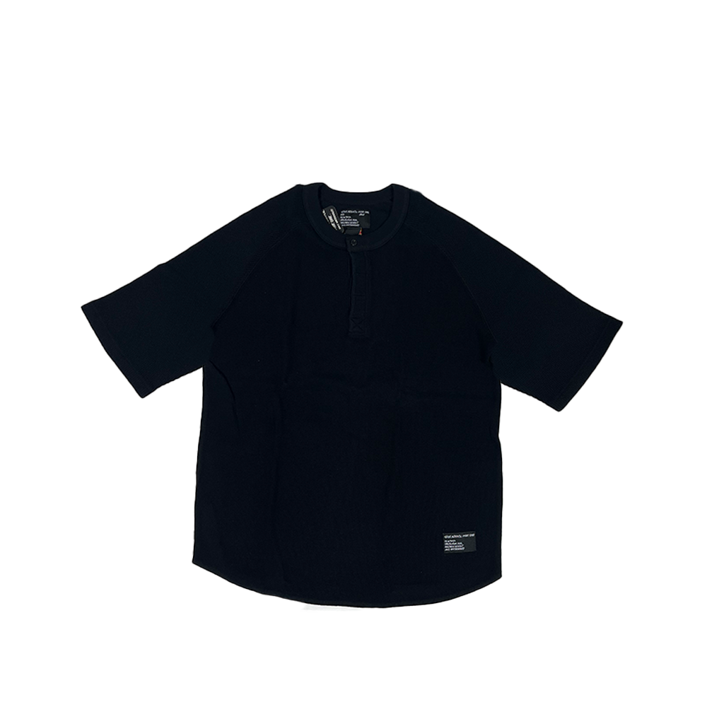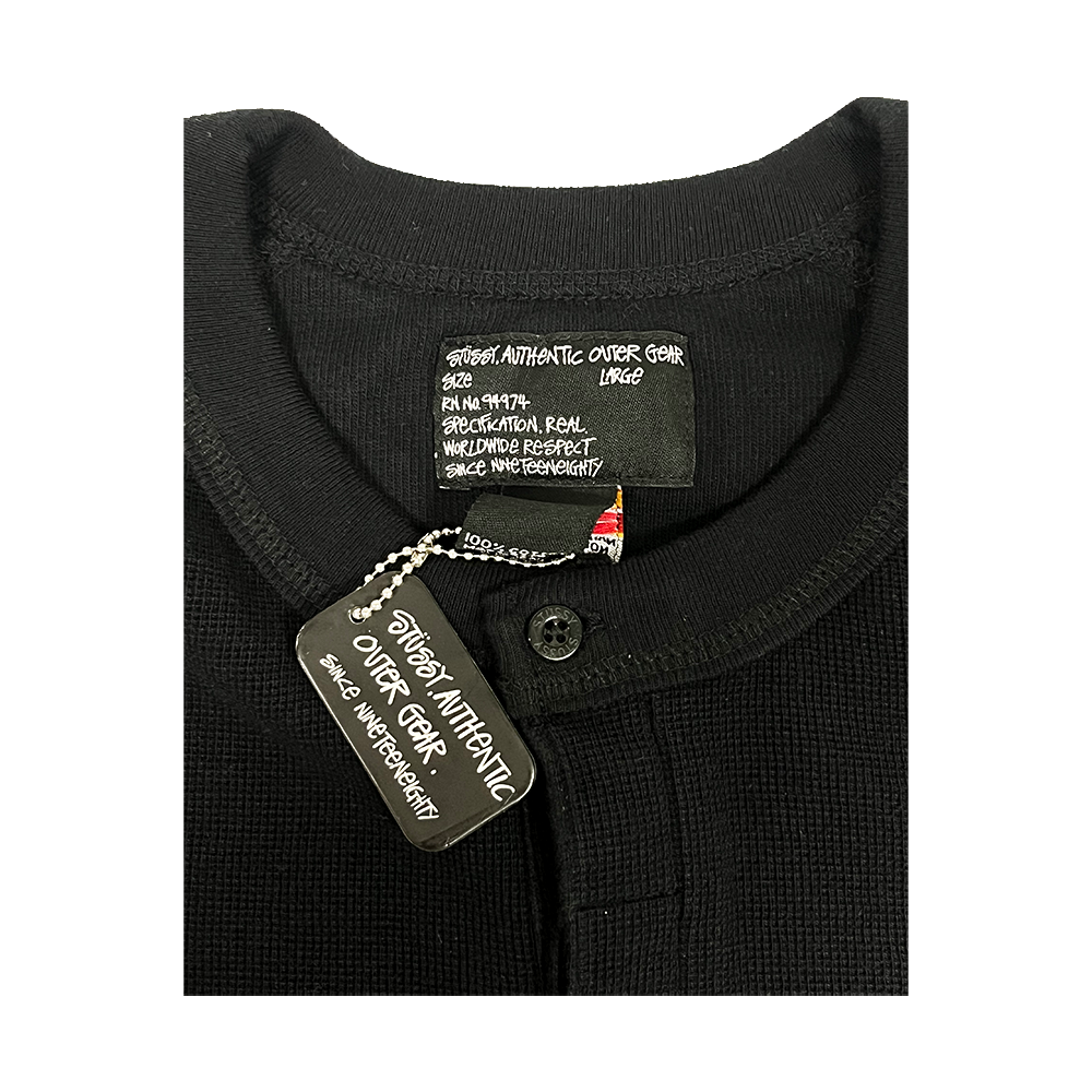 The Stussy Authentic Outer Gear T-shirt is a utility-inspired piece that recalls the technical and military aesthetic of the Californian brand. Crafted from heavy black waffle cotton, it features a loose silhouette with raglan sleeves and a front button closure. The front and back are embellished with labels and graphic details that feature the claim “Specification Real, Worldwide Respect, Since Nineteeneighty”. A retro and heritage-inspired T-shirt, perfect for a solid and functional urban style.