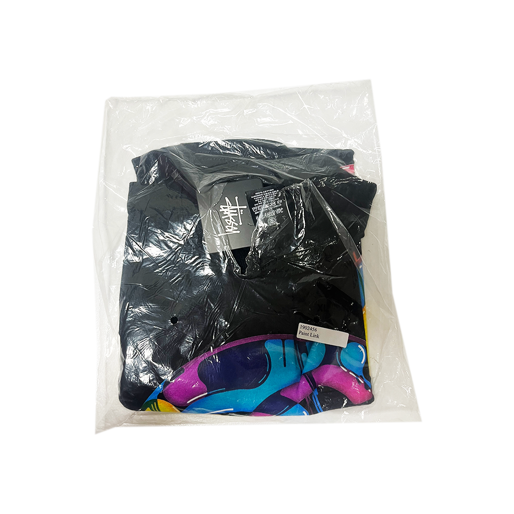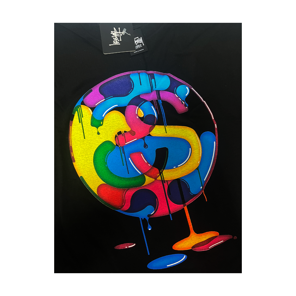 La t-shirt “Stüssy Paint Link” è un capo vintage piuttosto raro. Non esiste una data di rilascio ufficiale documentata, ma è probabile che risalga ai primi anni 2000, come suggerisce la presenza dell’etichetta “Silver Tag” e la cucitura singola (“single stitch”) tipica dei capi di quell’epoca. Una t-shirt d’impatto visivo firmata Stussy, con una grafica frontale che fonde estetica pop, cromatismi acidi e street art. Il protagonista è il classico logo “S” inscritto in un cerchio, reinterpretato in chiave liquida con colature multicolore effetto vernice: blu, giallo, rosa, verde e rosso si fondono in una composizione psichedelica dal sapore anni ’90. La stampa centrale su jersey nero crea un contrasto audace che valorizza il design. L’etichetta interna “Have a Good Vibe” e il tag appeso Stüssy Gear confermano l’autenticità del pezzo, venduto come dead-stock in condizioni archivio. Un capo perfetto per chi cerca grafiche iconiche e colori fuori dagli schemi.
