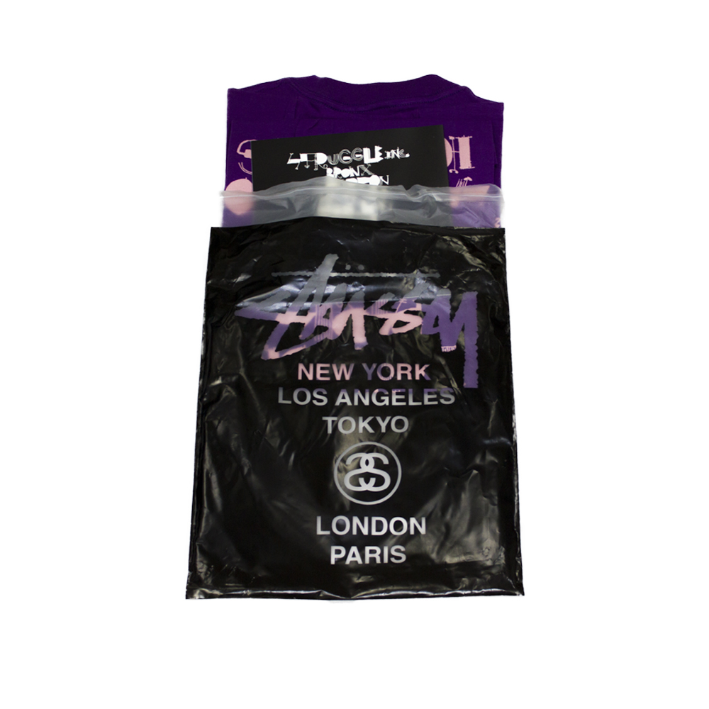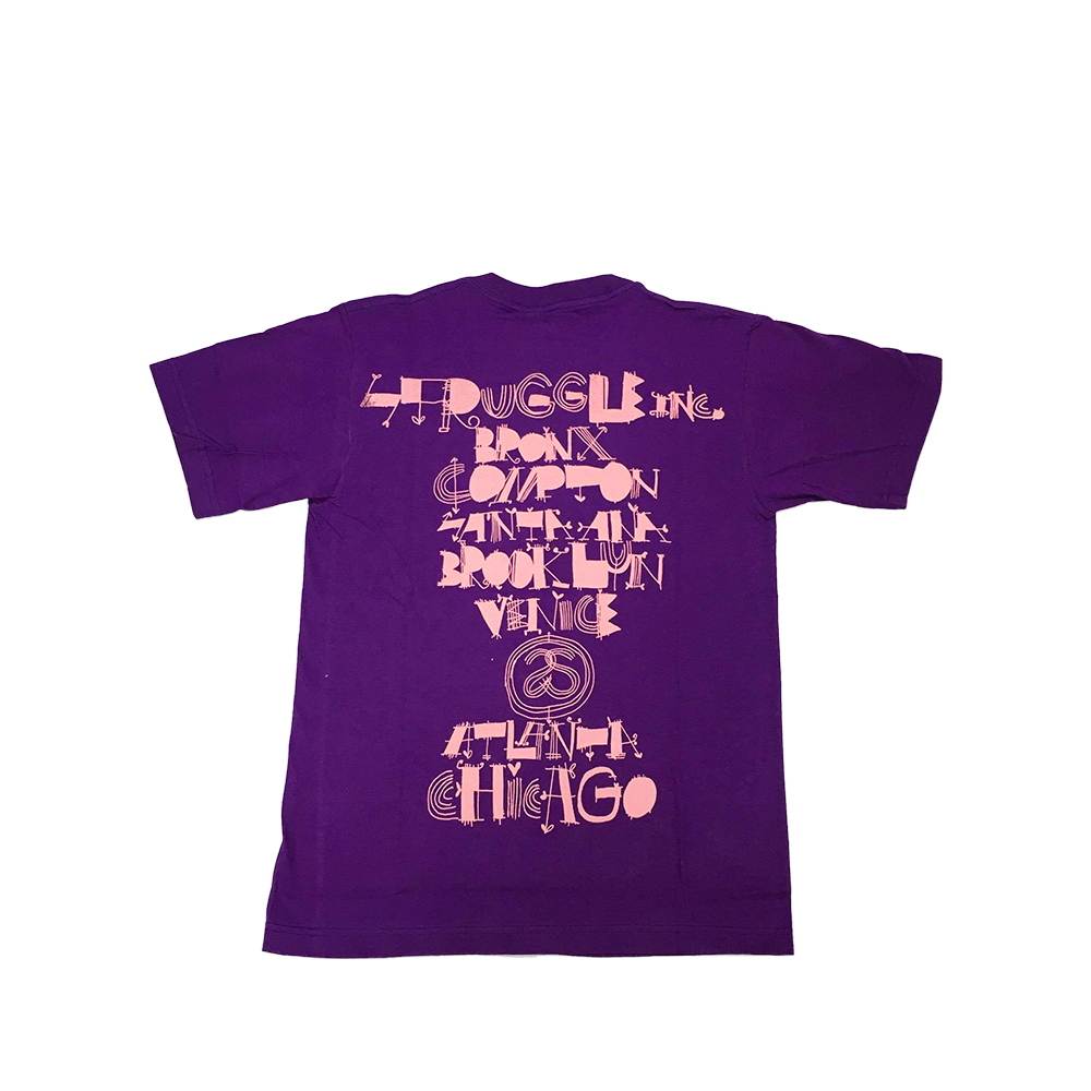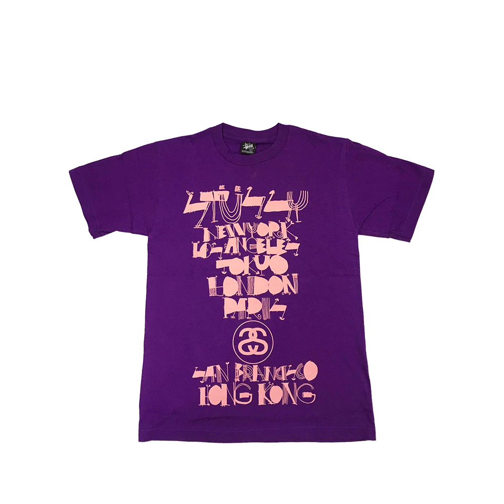 L’autunno del 1989 è stato ricordato per la prima uscita della t-shirt Stussy World Tour. Shawn Stussy ha creato quello che sarebbe diventato un concetto duraturo nel design grafico di t-shirt. L’idea e l’esecuzione erano semplici: accostare due culture di mondi tradizionalmente diversi – un dispositivo di stile che era stato usato nell’arte e nella musica. Sul davanti della maglietta, i nomi delle città associate ai giganti della moda e del glamour di fascia alta sono scritti in un tipo elicoidale stoico e formale. Londra, Parigi, Los Angeles, New York, Tokyo, queste erano le città considerate le capitali dello stile del mondo contemporaneo. La parte posteriore della maglietta era stampata con nomi di quartieri in cui il nostro tipo di cultura di strada era in realtà fiorente. Considerate oscure e sotterranee, queste aree urbane non sfruttate stavano per scuotere il mondo. Scarabocchiato in un manoscritto disegnato a mano, il retro della maglietta si scontra con la parte anteriore in stile, aspetto e significato. Il graffito è stato un grido per queste città: Brooklyn, Bronx, Compton, Santa Ana e Venezia, e sta nuovamente riprendendo una nuova atmosfera, direzione e atteggiamento.