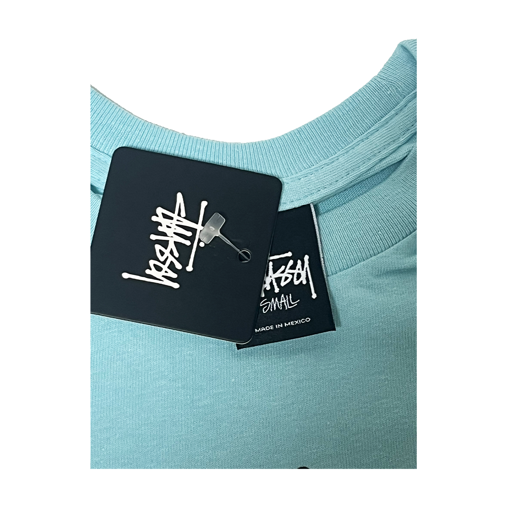 A rare archive piece that blends punk wit with surf-art vibes. The front graphic features a bold white cartoon skull outlined in black, crossed by icy-blue blade-like bones. Above it, “Stussy” appears in swirling spiral lettering drawn in the brand’s early-2000s hand-style. The heather fuchsia jersey sets off the vibrant print, and the hang-tag confirms its dead-stock condition. A tee that captures Stüssy’s playful, rebellious spirit—ideal for collectors and vintage streetwear fans alike.