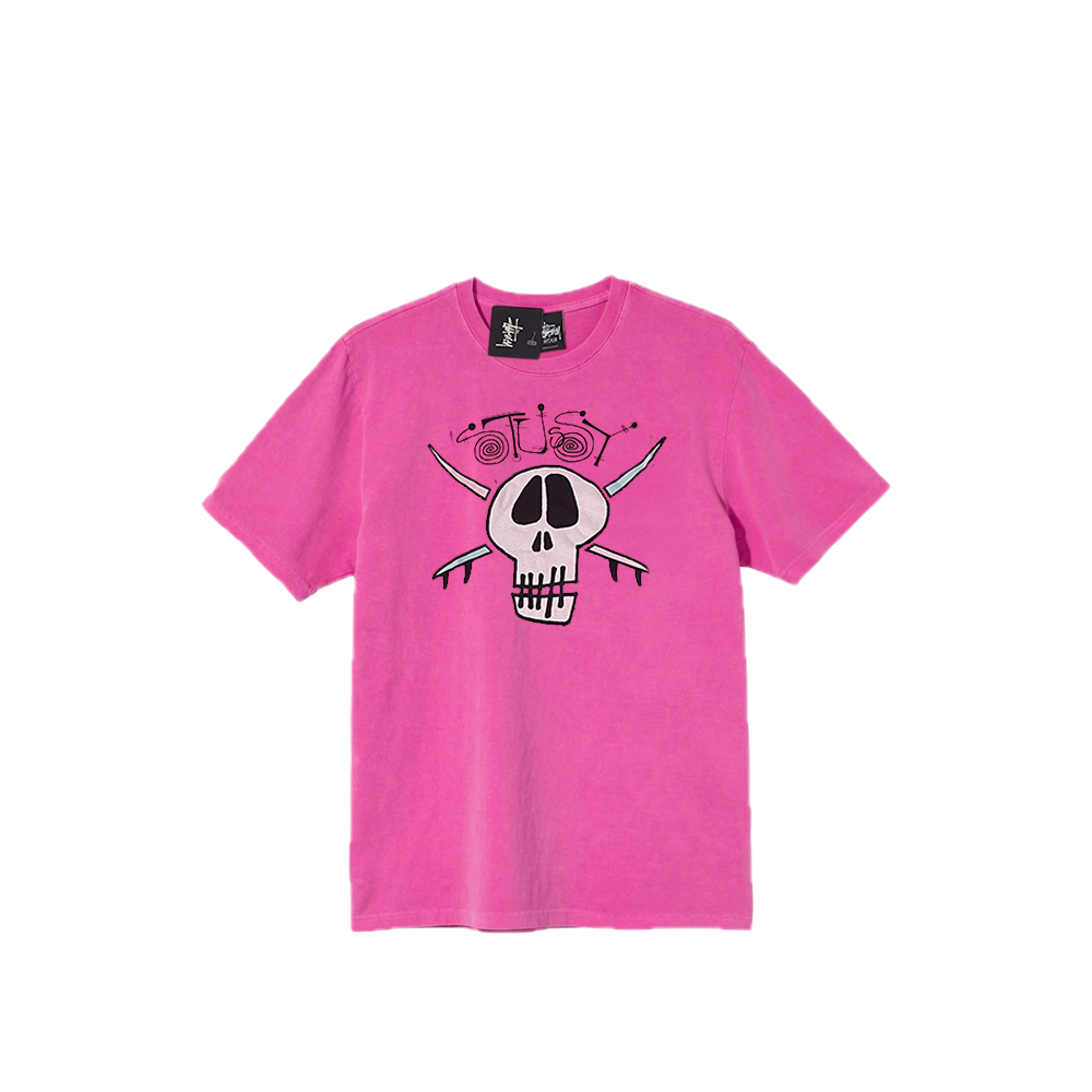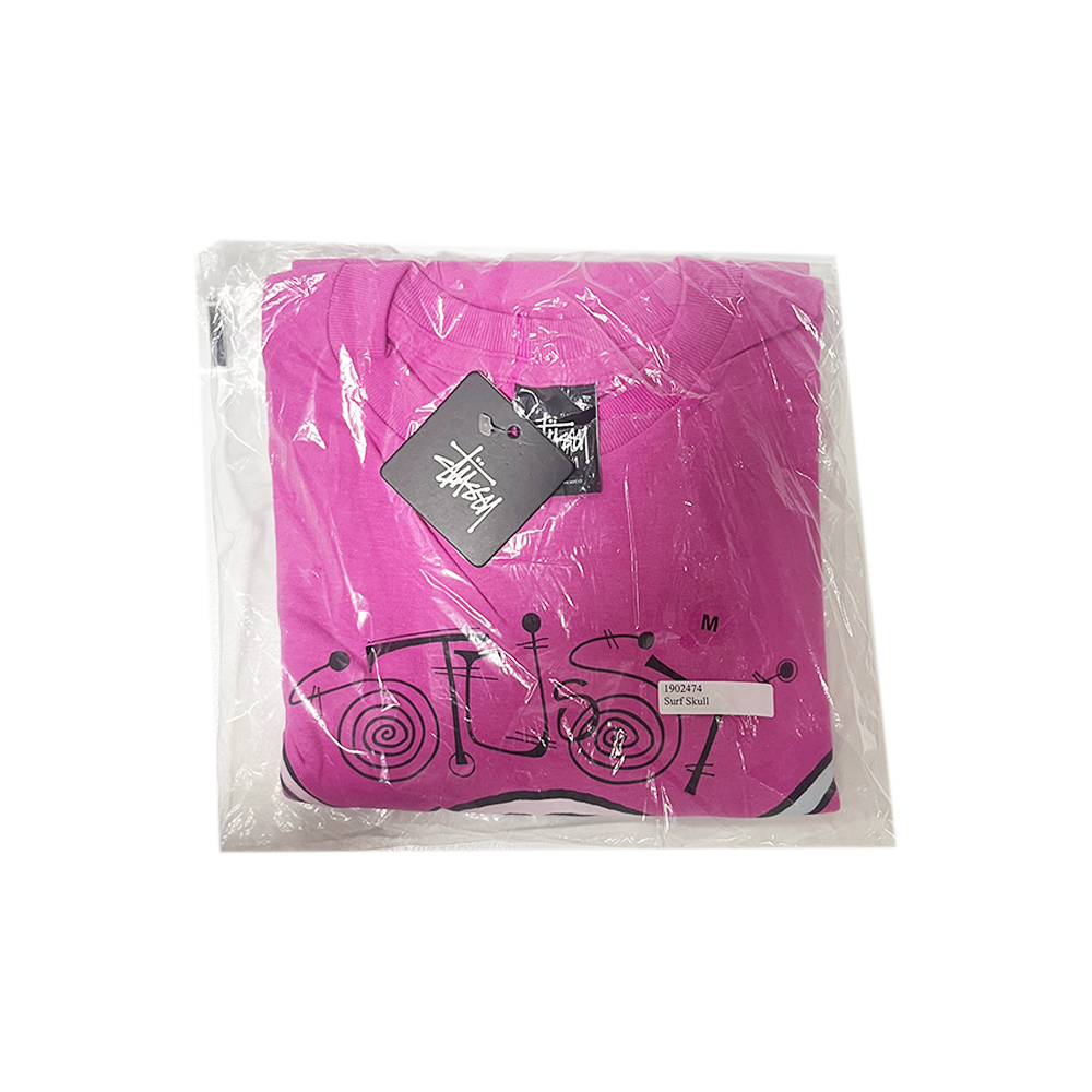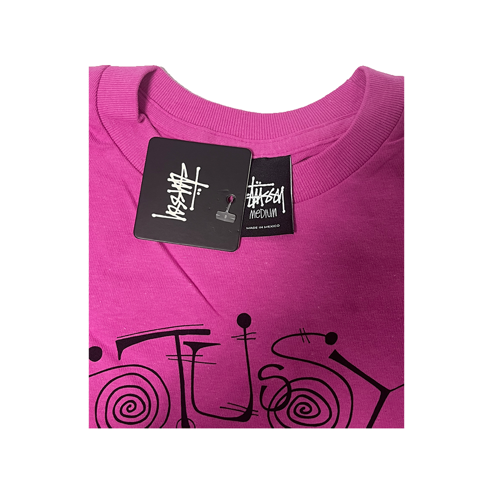 A rare archive piece that blends punk wit with surf-art vibes. The front graphic features a bold white cartoon skull outlined in black, crossed by icy-blue blade-like bones. Above it, “Stussy” appears in swirling spiral lettering drawn in the brand’s early-2000s hand-style. The heather fuchsia jersey sets off the vibrant print, and the hang-tag confirms its dead-stock condition. A tee that captures Stüssy’s playful, rebellious spirit—ideal for collectors and vintage streetwear fans alike.