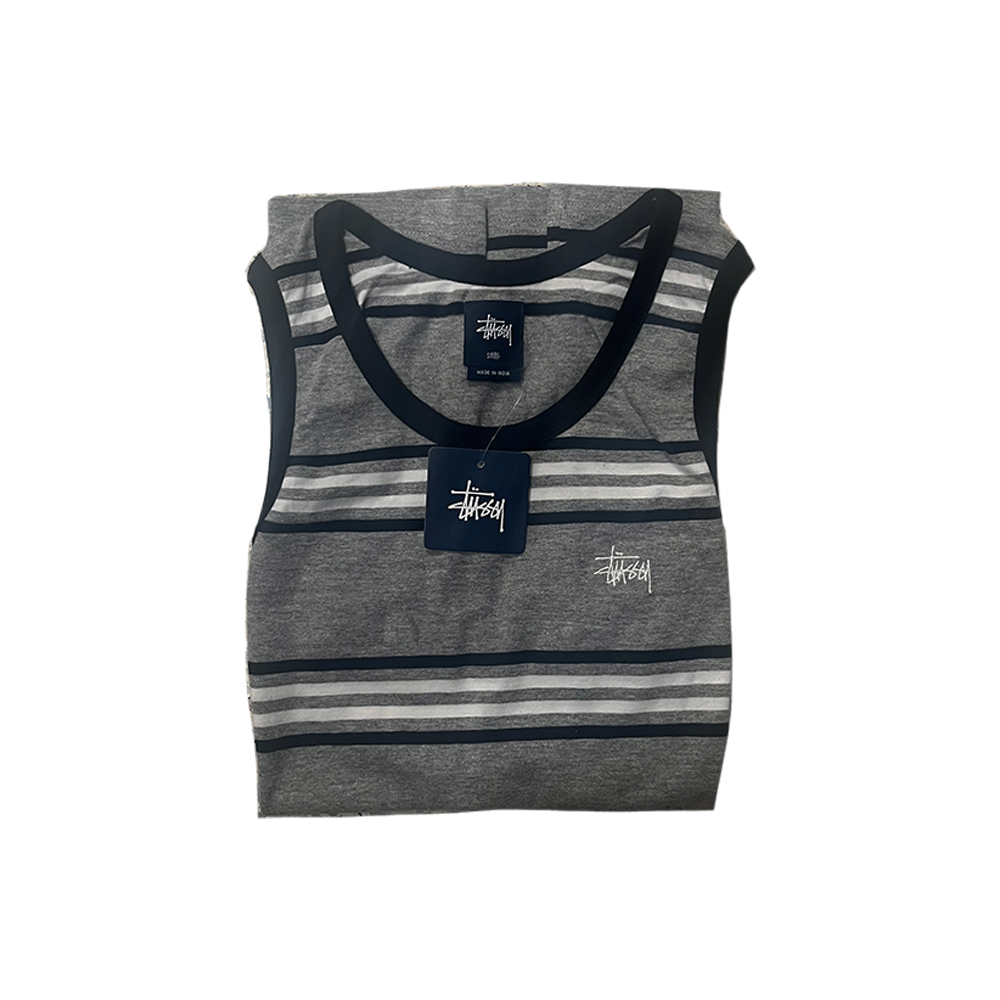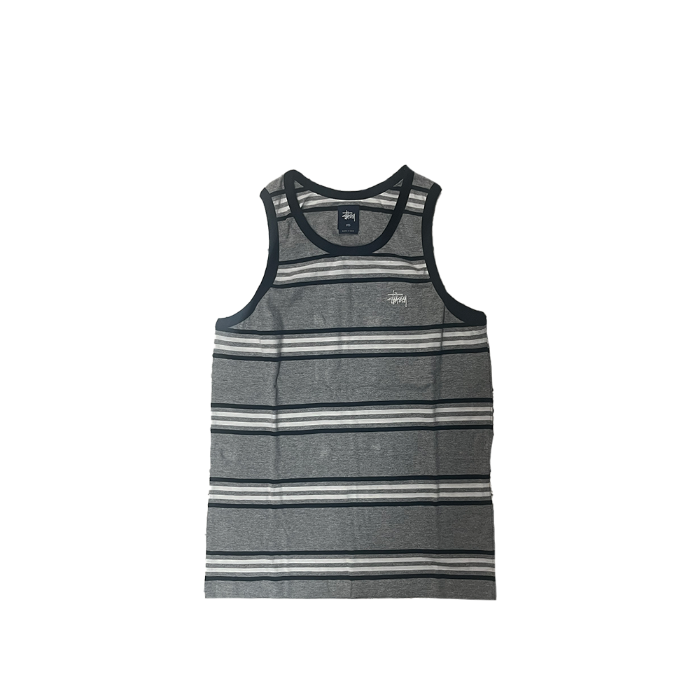 A sleeveless tank top with a minimal yet bold design, the Walter Tank by Stussy features a black and white horizontal stripe pattern on a gray melange background. Finished with contrasting black trim at the armholes and neckline, it’s complemented by a subtle Stussy logo embroidery on the chest. Made from soft, lightweight cotton, it’s perfect for summer and easily pairs with streetwear or casual everyday looks.