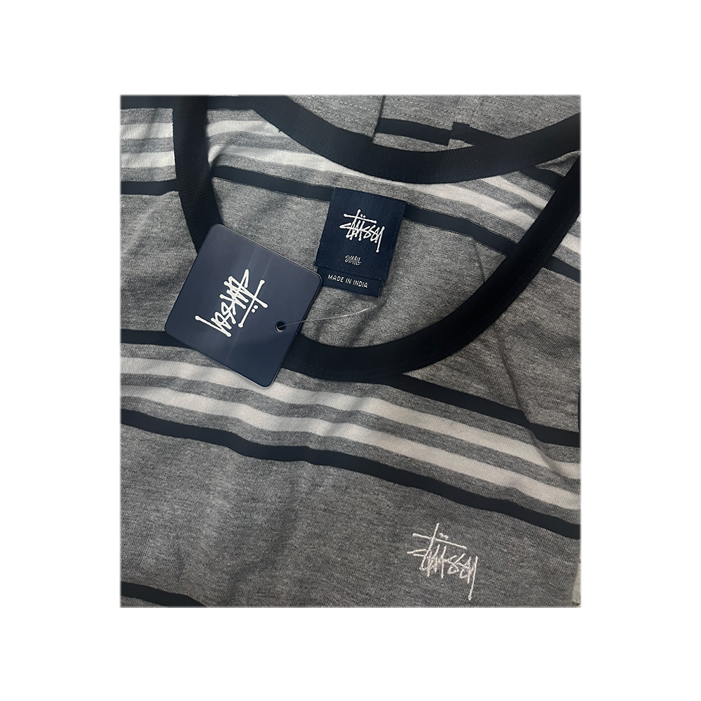 Canotta smanicata dal design minimal ma deciso, la Walter Tank di Stussy sfoggia una trama a righe orizzontali bianche e nere su fondo grigio mélange. Rifinita con bordature a contrasto nere su giromanica e scollo, è completata da un ricamo discreto del logo Stussy sul petto. Realizzata in morbido cotone leggero, è perfetta per la stagione estiva e si abbina facilmente a look streetwear o casual da tutti i giorni.
