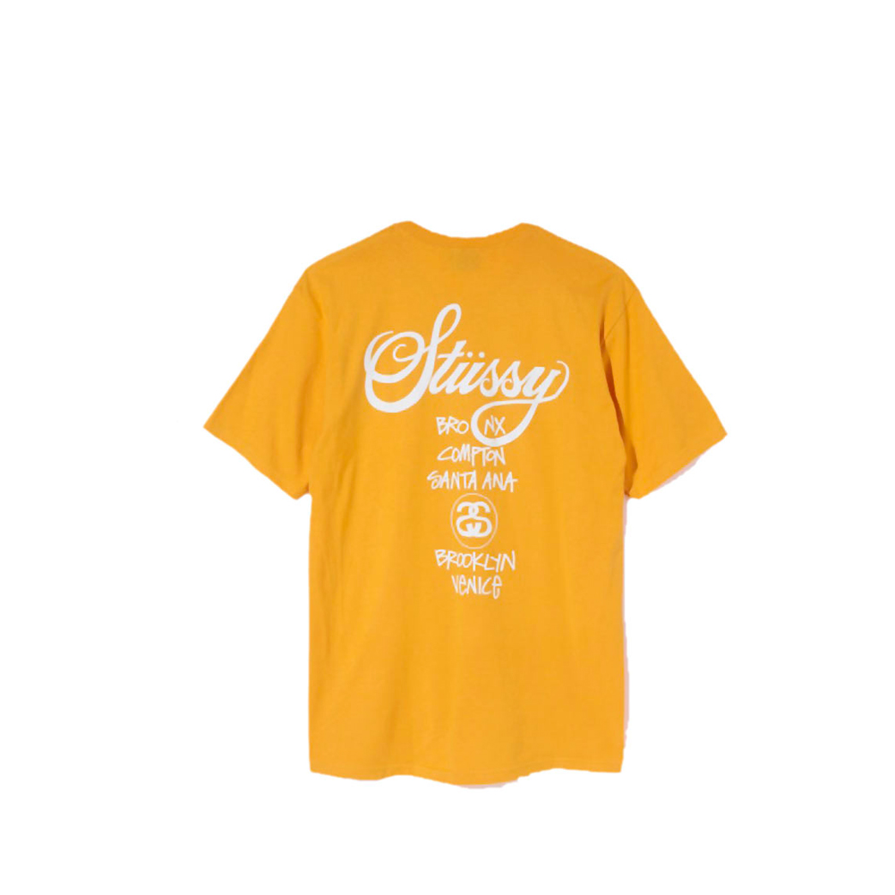 L’ autunno del 1989 è ricordato per la prima uscita della maglietta Stussy World Tour. Shawn Stussy ha creato quello che sarebbe diventato un concetto duraturo nei disegni di t-shirt grafiche. L’idea e l’esecuzione erano semplici:contrapporre due culture dai mondi tradizionalmente diversi – uan linea di stile che era stata usata nell’arte e nella musica. Sulla parte anteriore della t-shirt, nomi di città associate a giganti della moda di fascia alta e glamour sono scritti in un formale Helvetica. Londra, Parigi, Los Angeles, New York, Tokyo, queste sono state le città considerate capitali dello stile del mondo contemporaneo. Il retro è stato stampato con nomi di borghi dove il nostro tipo di cultura di strada era davvero fiorente. Considerate buie e sotterranee, queste aree urbane non sfruttate stavano per scuotere il mondo. Scrawled in un manoscritto disegnato a mano, la parte posteriore della t-shirt si scontra con il fronte in stile, look e significato. I graffiti erano un grido di questa band di outsider – Brooklyn, Bronx, Compton, Santa Ana e Venezia – nel 2006 Stussy ha reinventato questa classica e iconica T-Shirt con il World Tour Project. Un gruppo di oltre 40 artisti è stato selezionato a mano e invitato a fare la loro interpretazione della maglietta World Tour. Sono grafici, graffiti artist, designer di abbigliamento e fumettisti. Il loro stile unico di scrittura manuale e la visione artistica sono stati scelti specificamente per adattarsi alla nostra ethos e identità. Le t-shirt sono state distribuite in piccoli gruppi a partire dal marzo 2006 e nuovi design sono stati abbandonati durante tutto l’ anno. Il secondo semestre dell’anno ha visto anche alcuni eventi speciali e collaborazioni per questo progetto. Tutti hanno costruito e creato nuove pagine in una storia senza fine.