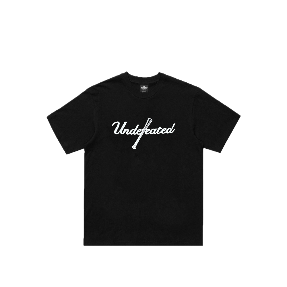 Premium black cotton tee featuring the clean “Bat Script” graphic. A white cursive UNDEFEATED wordmark spans the chest, sliced through by a tilted baseball bat that cleverly doubles as the letter “f”—a perfect blend of sports heritage and timeless street style. Blank back keeps the focus up front. Finished with a 1×1 ribbed collar, Undefeated “Official Product” neck label (assembled in Mexico of US components) and a comfortable regular fit—an everyday staple ready for both the diamond and the city.