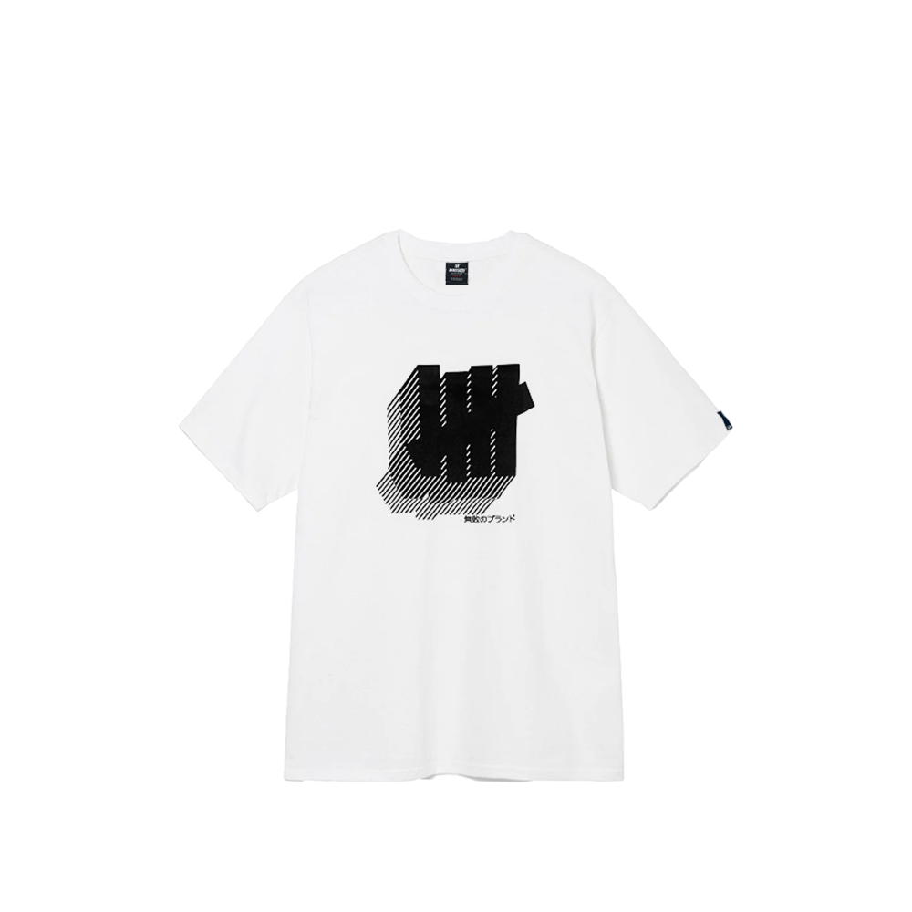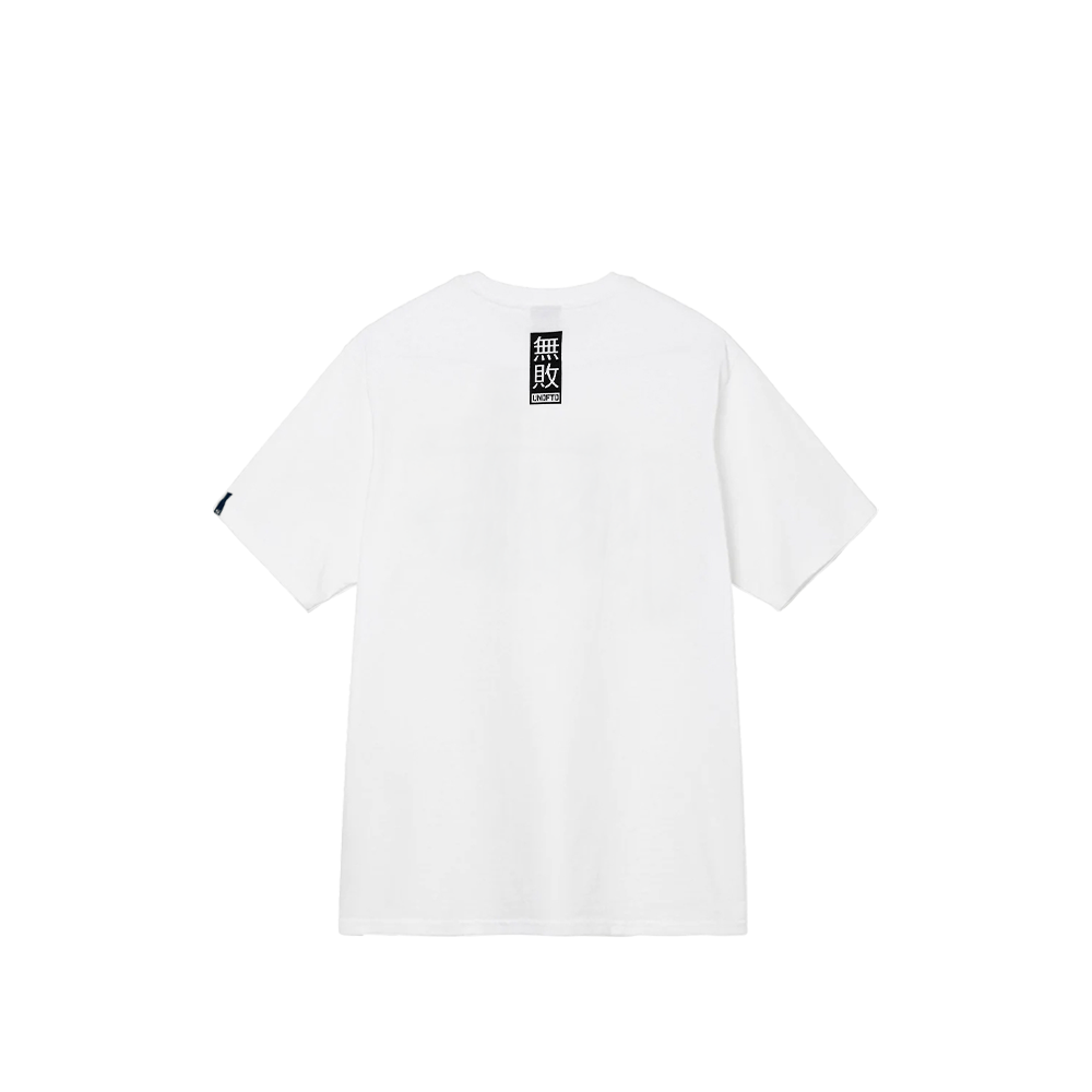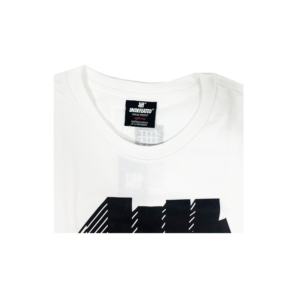 UNDEFEATED Premium white cotton tee with a clean, iconic graphic. The front showcases the legendary Five-Strikes logo, reworked with diagonal line shading for extra depth and motion—subtle yet instantly recognisable street energy. A small Japanese tagline sits below, while a vertical 無敗 (“undefeated”) tag hits the upper back for that insider detail. Finished with a 1×1 ribbed collar, “Official Product” neck label and a classic regular fit. Simple, versatile, unbeatable.