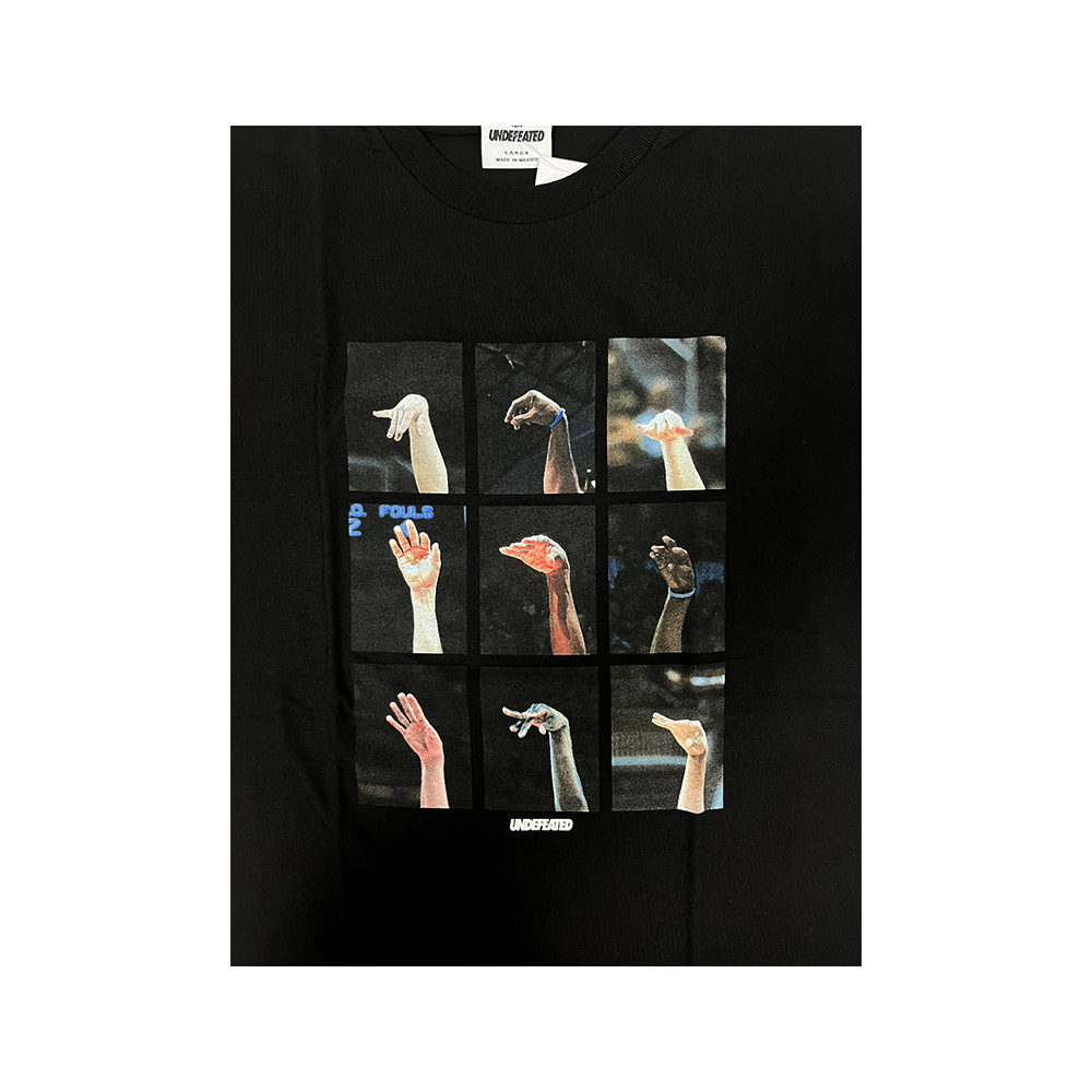 White cotton T-shirt with bold “Following Through” graphic. The front features a 3×3 grid of photographs that immortalize nine different hands in the iconic follow-through gesture after a shot, emphasizing the precision and style typical of basketball. The contrast between the light fabric and the vivid color print highlights the action, while the UNDEFEATED logo appears below the composition. Interior label with Undefeated branding and “Made in Mexico” words. Regular fit.