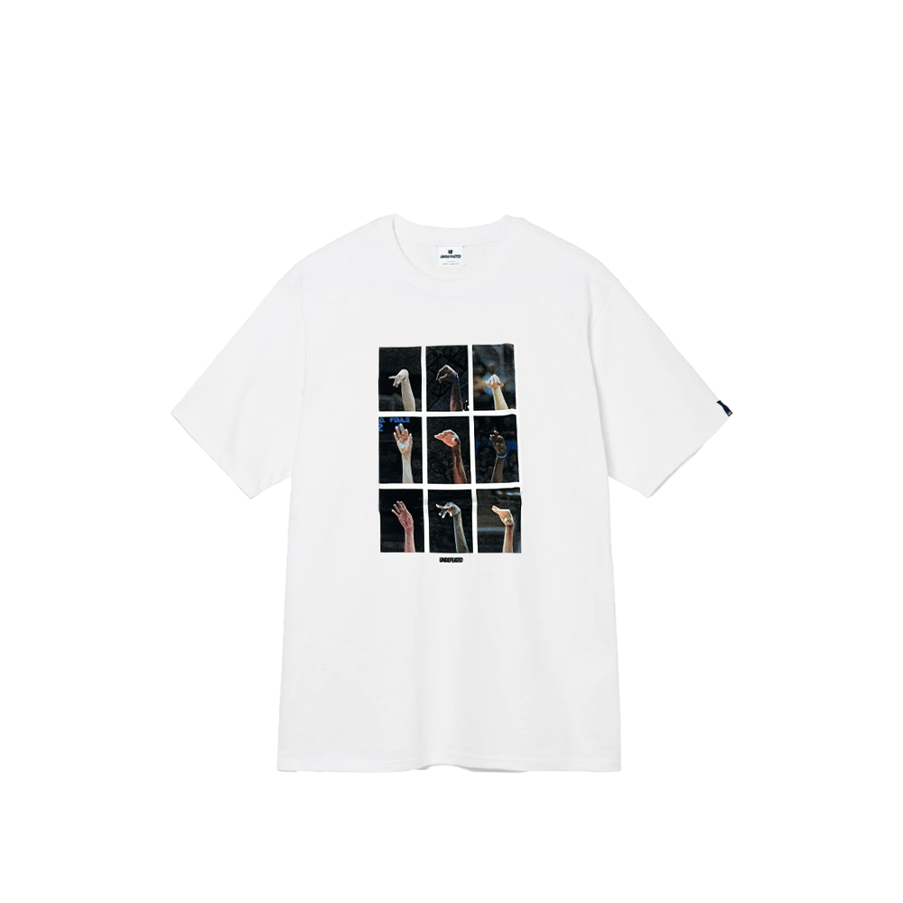 White cotton T-shirt with bold “Following Through” graphic. The front features a 3×3 grid of photographs that immortalize nine different hands in the iconic follow-through gesture after a shot, emphasizing the precision and style typical of basketball. The contrast between the light fabric and the vivid color print highlights the action, while the UNDEFEATED logo appears below the composition. Interior label with Undefeated branding and “Made in Mexico” words. Regular fit.