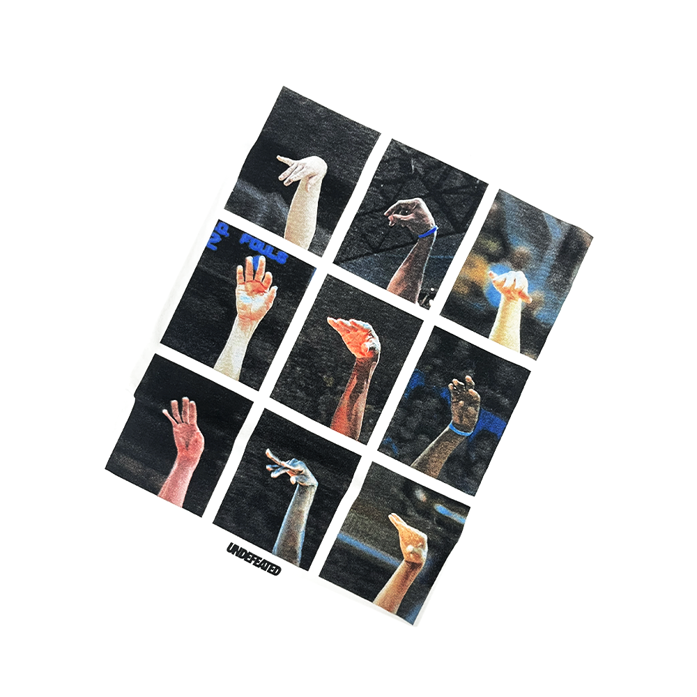 T-shirt in cotone bianco con grafica d’impatto a tema “Following Through”. Il fronte presenta una griglia 3×3 di scatti fotografici che immortalano nove mani diverse nell’iconico gesto di follow-through dopo il tiro a canestro, enfatizzando precisione e stile tipici del basket. Il contrasto tra il tessuto chiaro e la stampa a colori vividi mette in risalto l’azione, mentre sotto la composizione compare il logo UNDEFEATED. Etichetta interna con marchio Undefeated e dicitura “Made in Mexico”. Vestibilità regular.