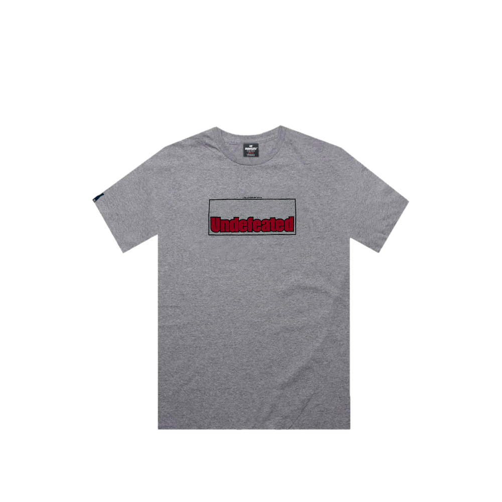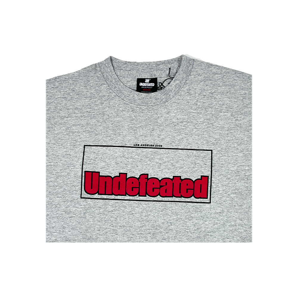 Grey heather cotton tee with a clean retro-style box logo front. The UNDEFEATED name pops in bright red, framed inside a minimal black box with LOS ANGELES 2002 printed above—a nod to the brand’s roots. The back stays crisp with only the signature black Five-Strikes logo under the collar.