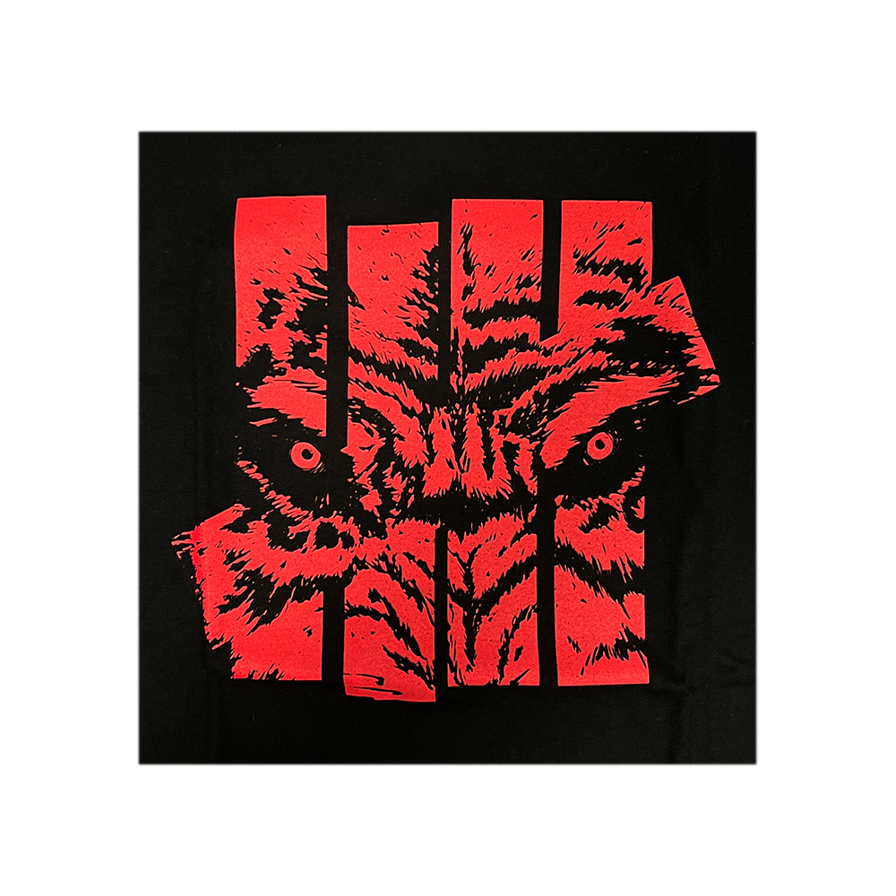 Premium black cotton tee with a bold “Wolf Strike” graphic. The iconic Five-Strikes logo explodes across the chest in vivid scarlet, revealing a snarling wolf’s eyes rendered in comic-style detail—razor-sharp lines and piercing pupils for true street-predator energy. The red-on-black contrast makes the piece unmissable, ready to own the spotlight day or night. Finished with a 1×1 ribbed collar, UNDEFEATED “Official Product” neck label (assembled in Mexico of US components) and a comfortable regular fit.