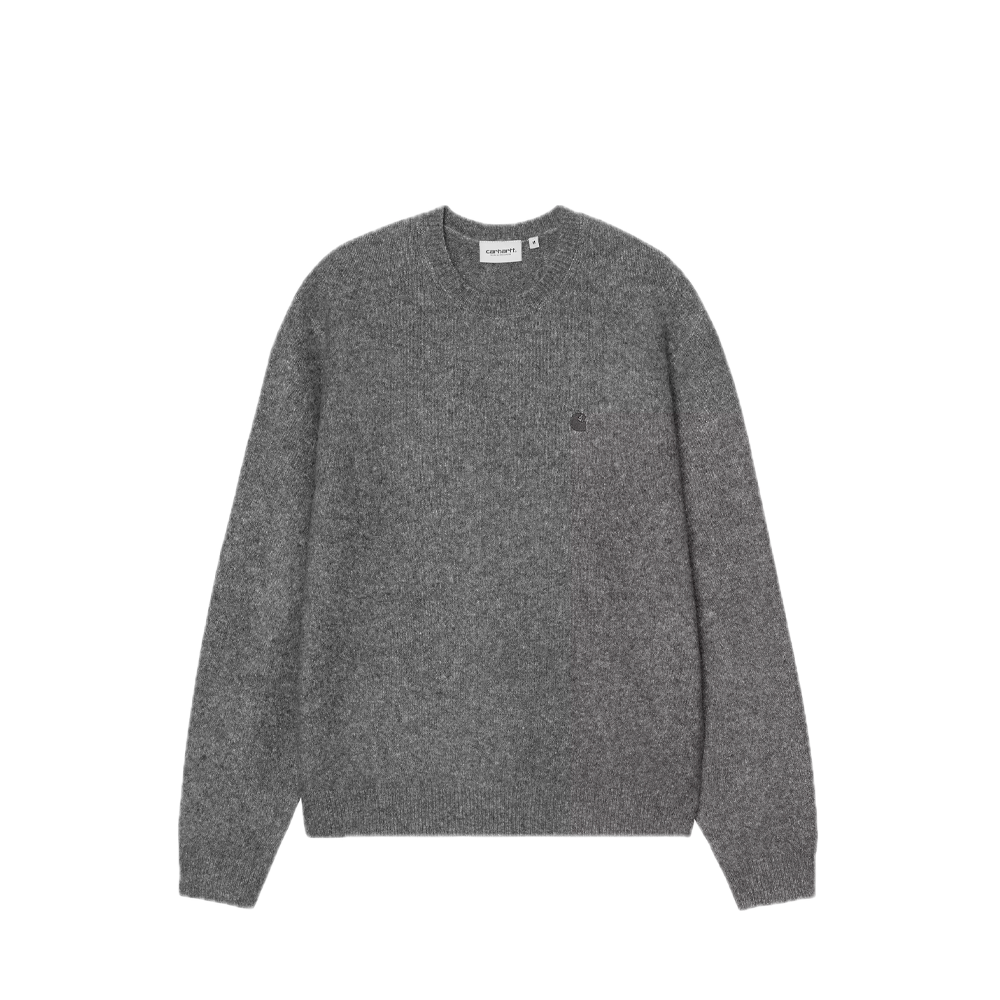 The Carhartt Wip Curtis Sweater is made from a soft blend of acrylic, recycled polyester, nylon, wool, and elastane. The sweater features an embroidered “C” logo on the chest.