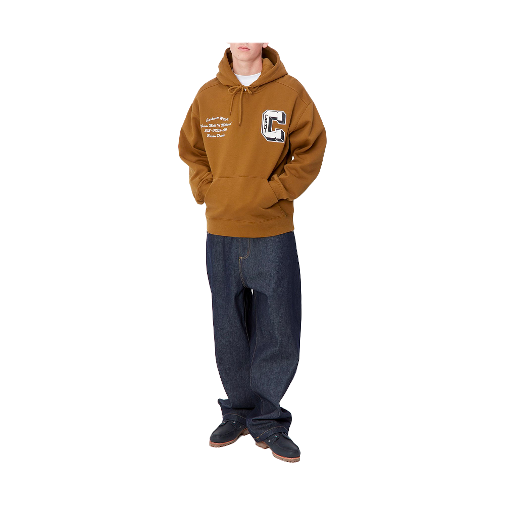 The Carhartt Hooded Brown Ducks Sweatshirt is crafted from heavy brushed polyester-cotton jersey for a plush feel. The balloon cut makes the sweatshirt looser and more comfortable, and it also features dropped shoulders and ribbed trims for a snug feel. The graphic embroidery and logo insert complete the model.