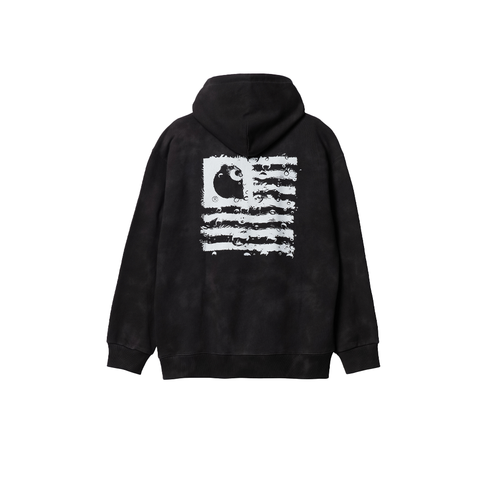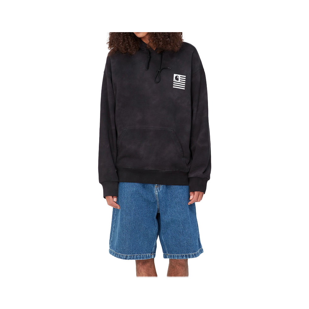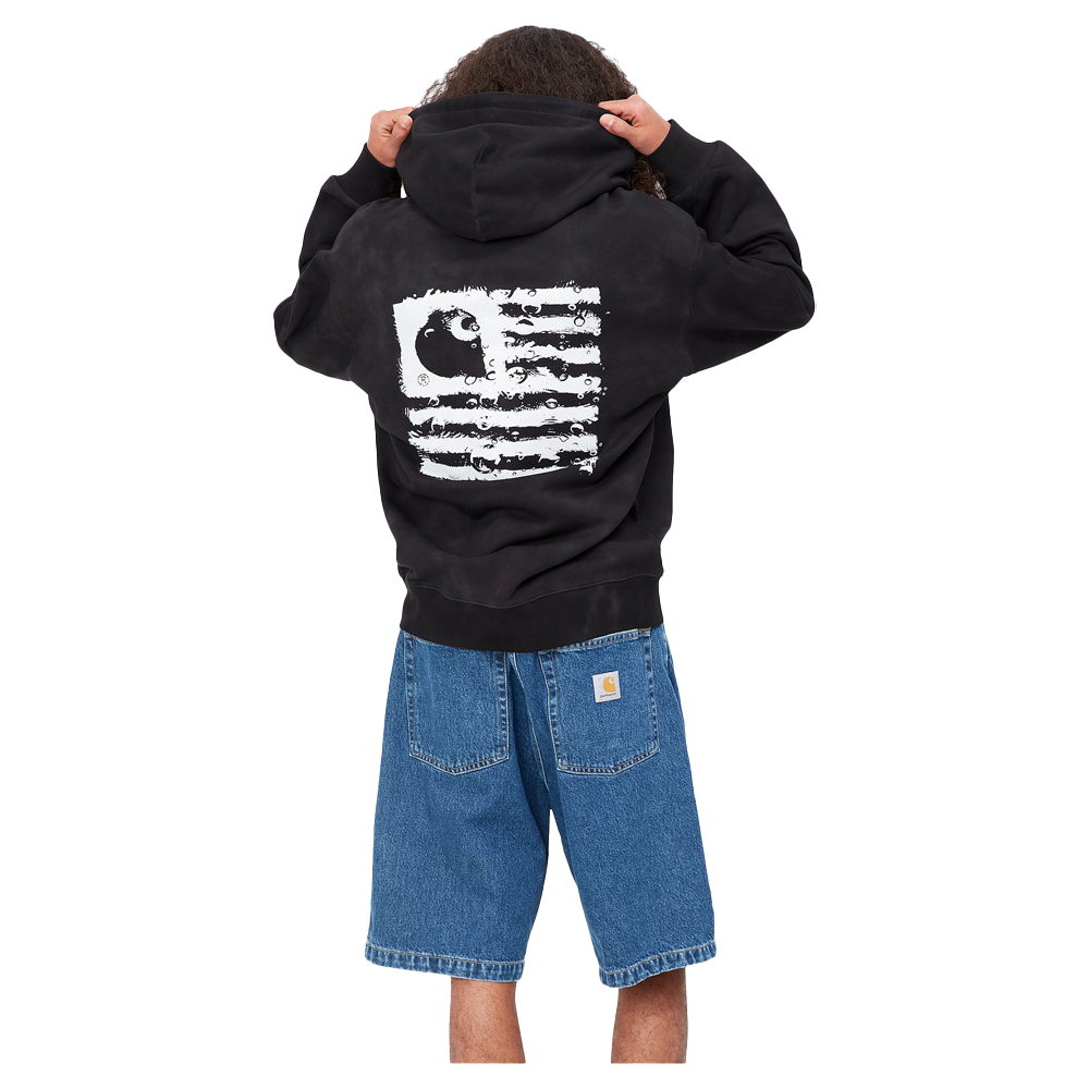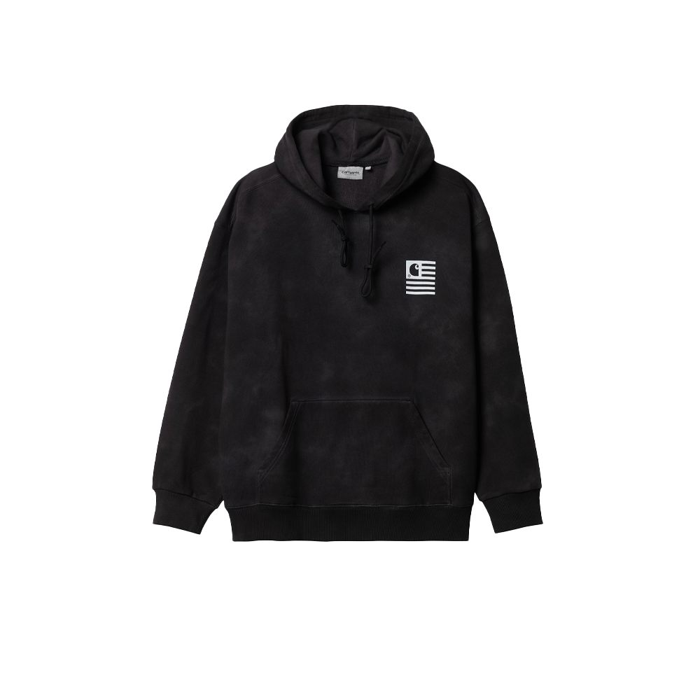The Carhartt WIP Hooded Chromo Sweatshirt is made of heavyweight cotton jersey in a balloon fit, which is a little looser and boxier, but also characterized by dropped shoulders and ribbed trims. The sweatshirt is also unbrushed, meaning that it has a tactile loopback construction. Additionally, it features an allover digital Chromo print inspired by tie dye. A new take on the State Flag print appears on the chest and back.