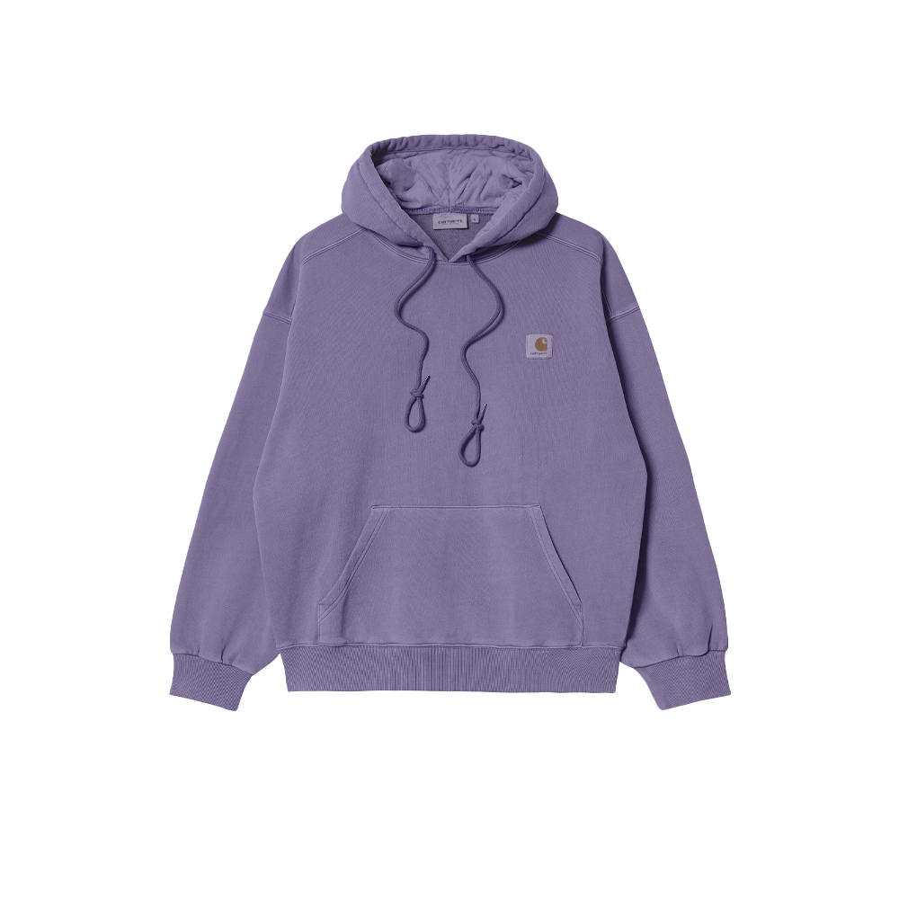 The Carhartt WIP Hooded Nelson Sweatshirt is constructed from heavyweight, unbrushed cotton jersey. The garment has been pigment dyed for a more saturated color. Features a kangaroo pocket and a diamond quilted hood with padded lining. This item has a bold ‘balloon’ fit, which is a little looser and boxier, but also characterized by dropped shoulders and ribbed cuffs. Finished with a classic woven Carhartt WIP label on the left chest.