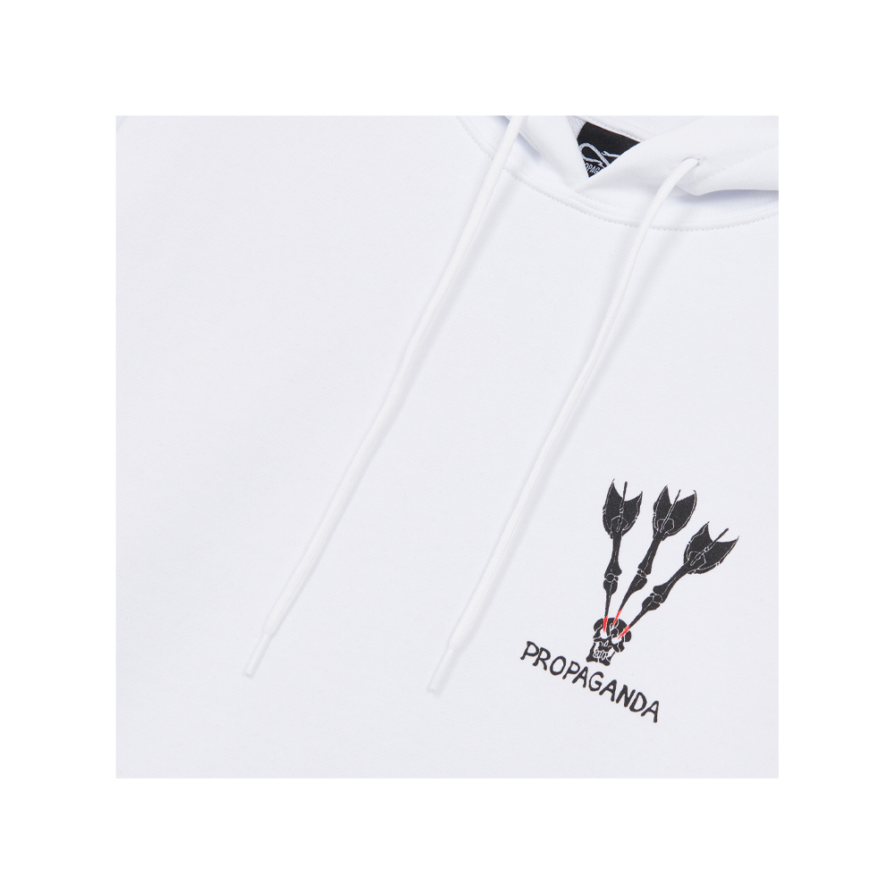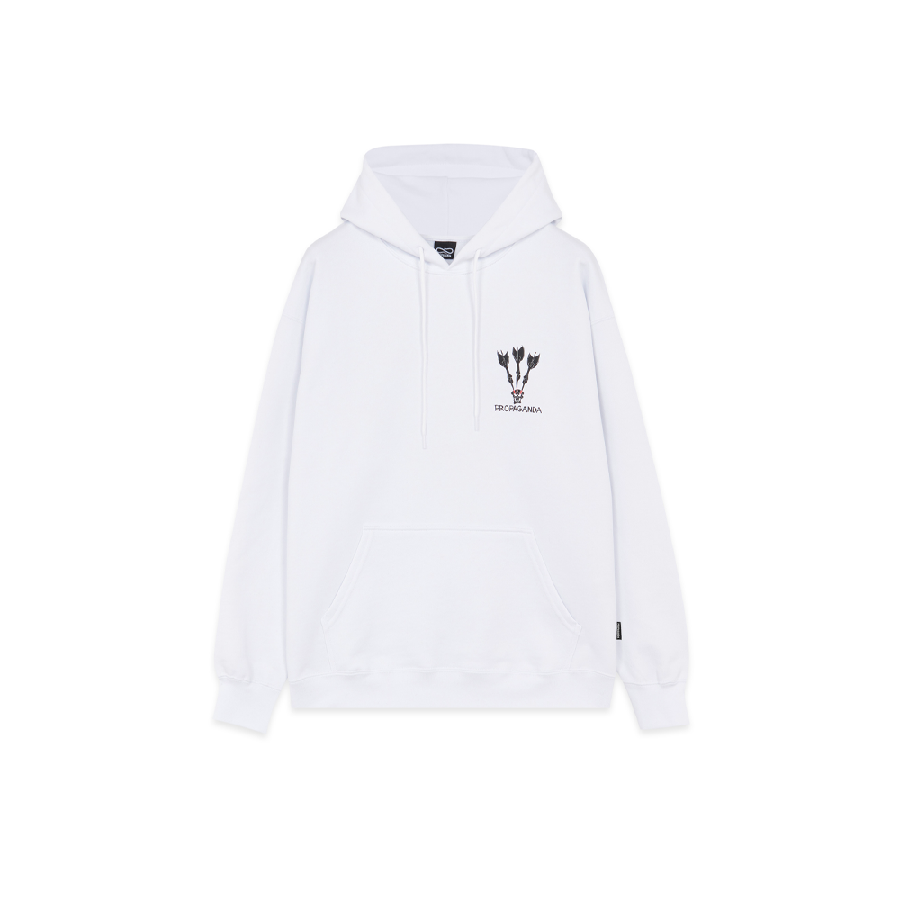 Propaganda hooded sweatshirt in cotton features screen printing on front and back.