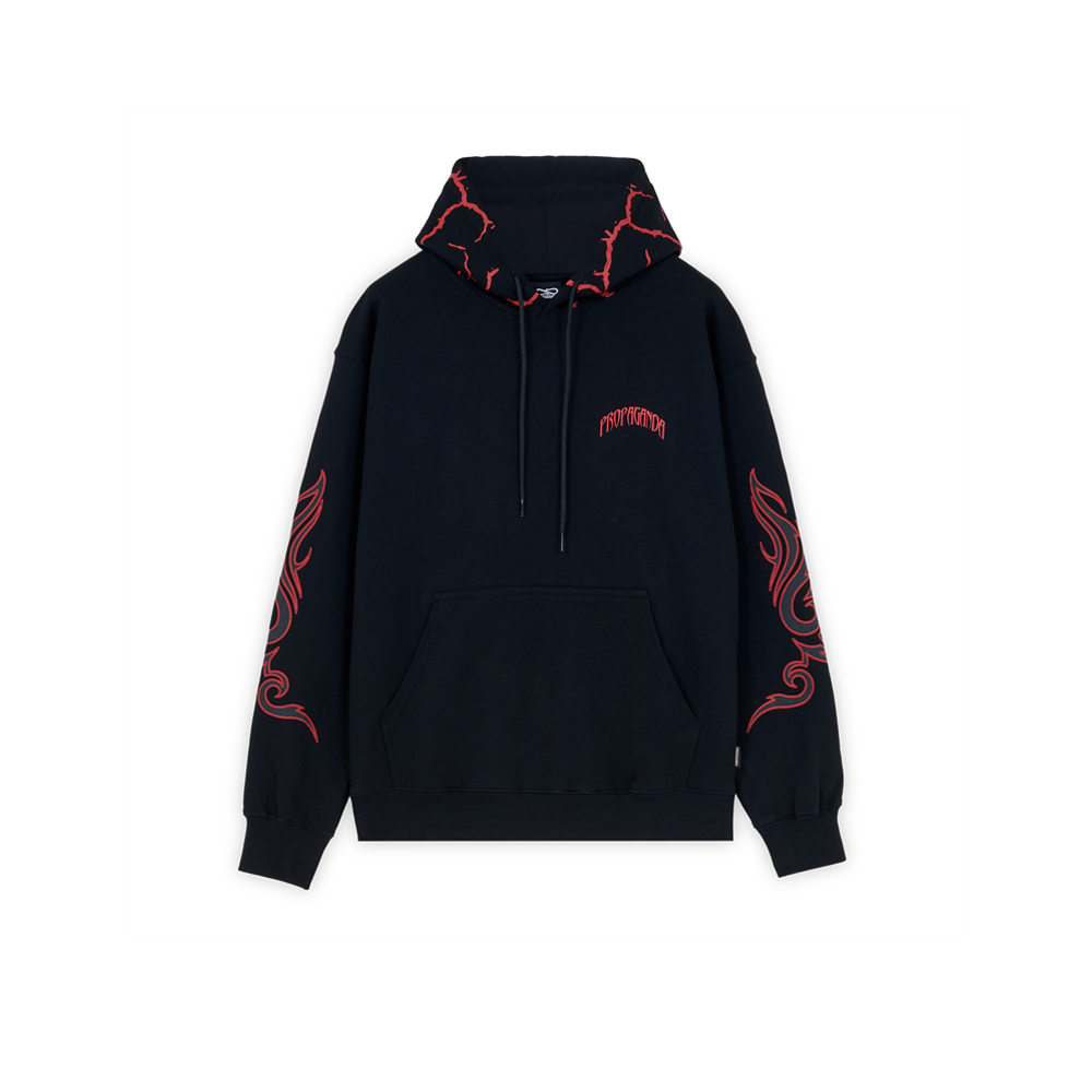 Propaganda hooded sweatshirt in cotton features screen printing on front, back and sleeves