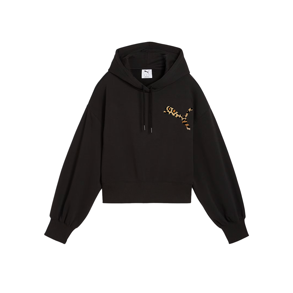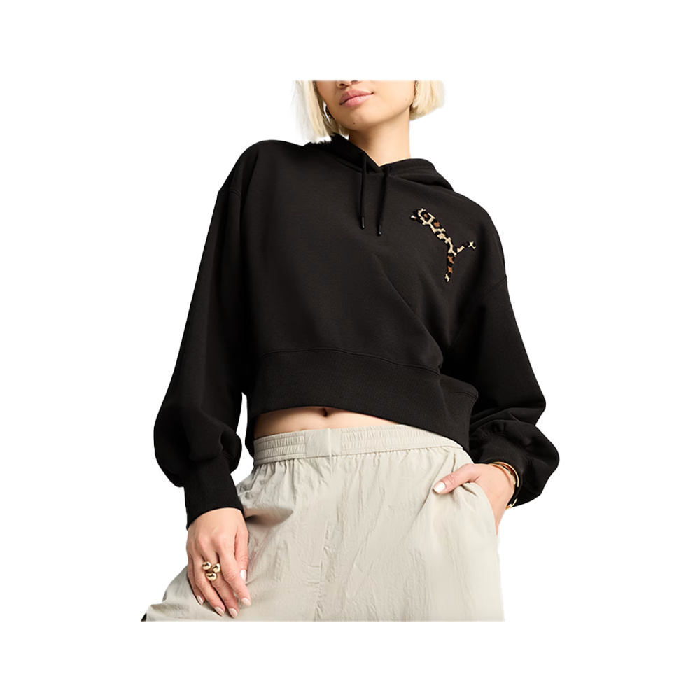 Step into fierce fashion with this Puma cropped hoodie. Featuring a leopard PUMA Cat logo, bell sleeves and tonal drawstrings, it’s all about making a statement. Ribbed hem and cuffs complete the look, ensuring you stand out effortlessly.