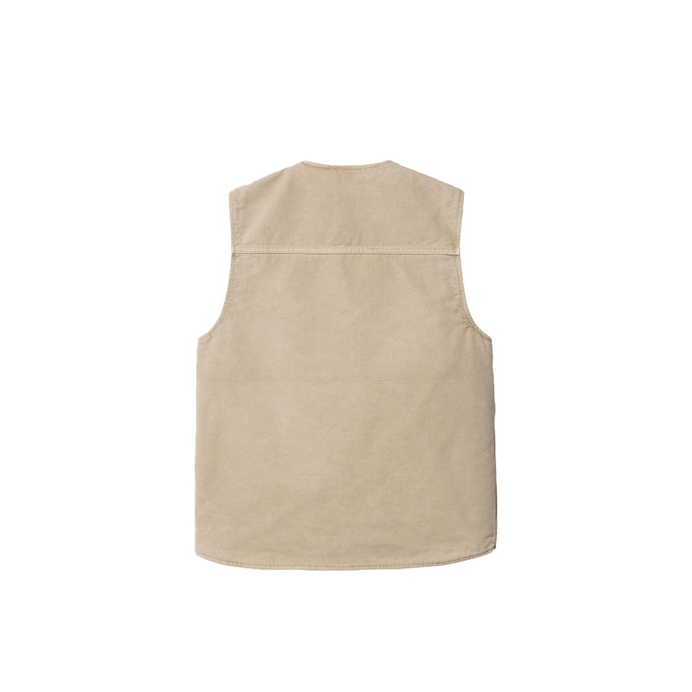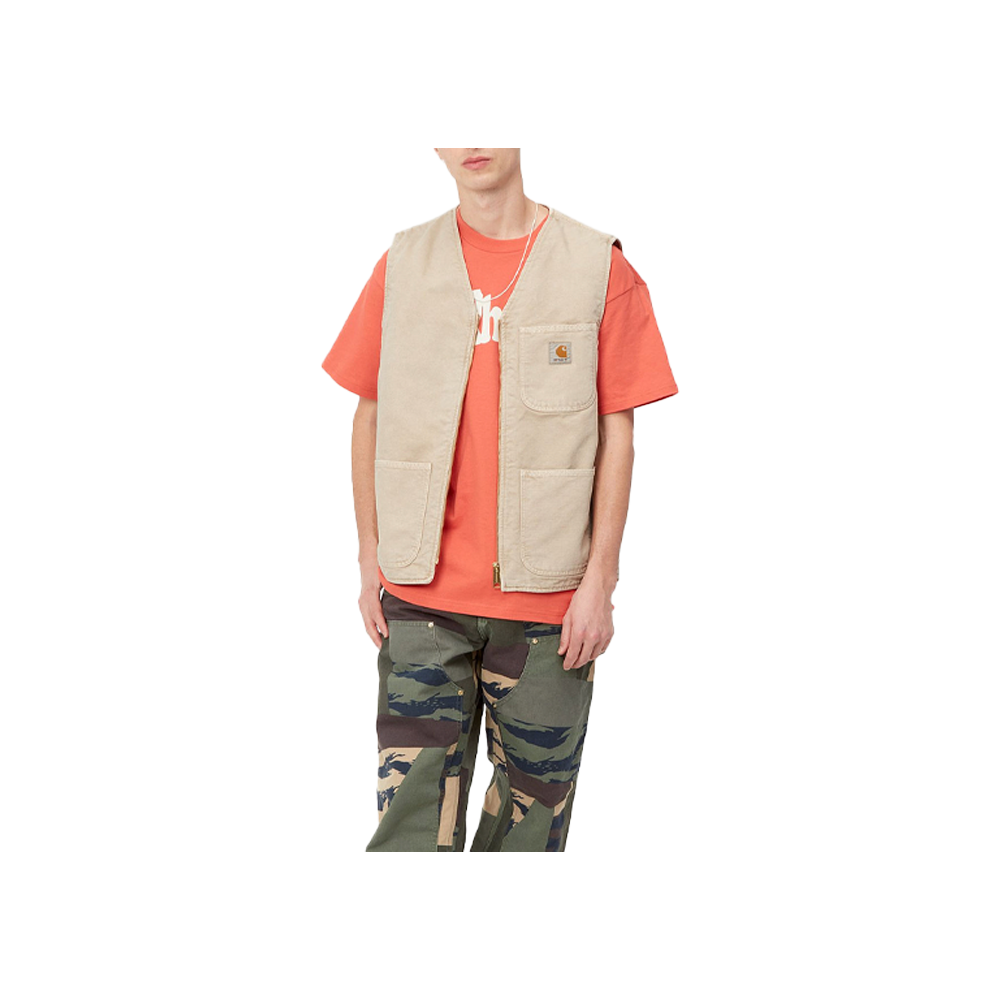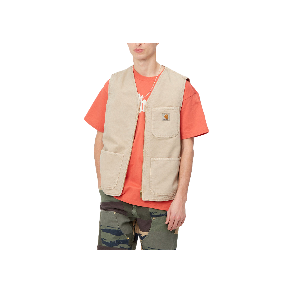 The Carhartt WIP Arbor Vest is constructed from our durable organic Dearborn Canvas and lined with cotton poplin. The fabric has gone through our ‘faded’ treatment, giving it a complex, washed-out coloration. The item features multiple pockets, inspired by classic workwear garments, as well as a gold front zip closure. It is finished with a woven Square Label logo on the left chest pocket.