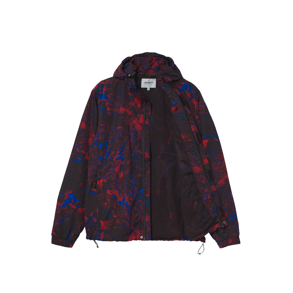 The Carhartt WIP Terra Jacket is made from lightweight 2.7-fold water repellent fabric and features a mesh lining to ensure breathability. Features seasonal all-over print, zip pockets, adjustable hood and bottom band with reflective drawstring. The garment is completed by a label with reflective writing on the pocket on the left side of the chest.