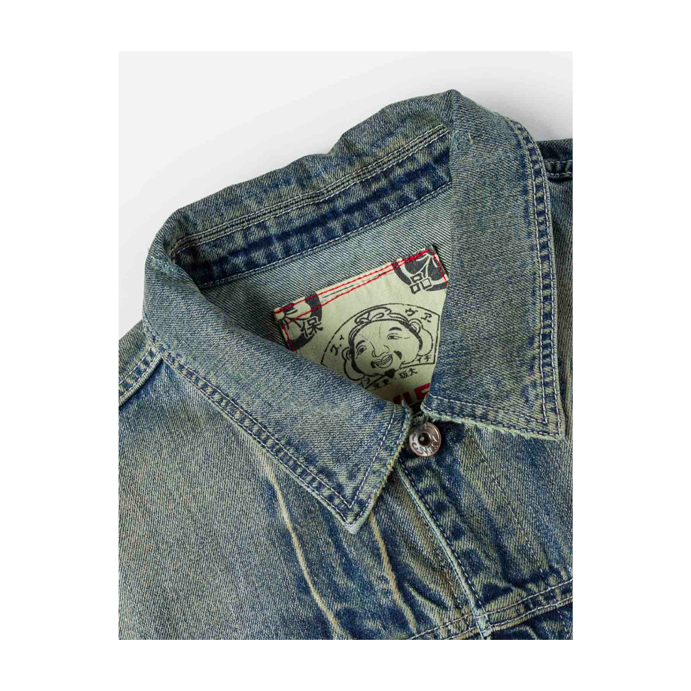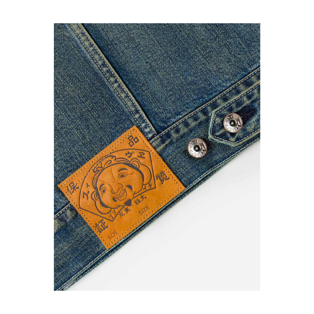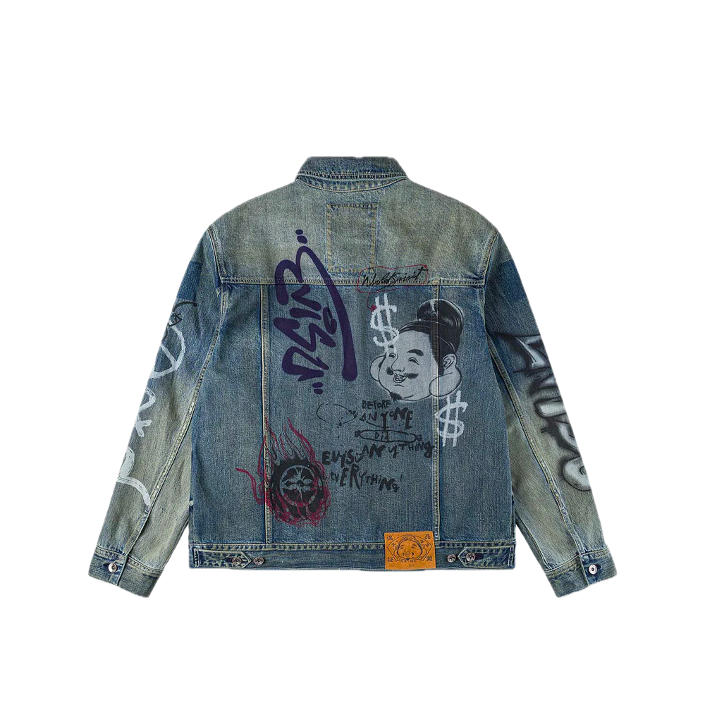 This relax-fit jacket leans into bold street style with allover graffiti prints—featuring faded Evisu Godhead, lettering and graphic motifs that wrap the fabric. Distressed frayed patches add a lived-in, vintage edge, while a branded leather patch and a playful graphic label inside the collar nod to the brand’s iconic details. It balances laid-back comfort with eye-catching artistic flair, making it a standout piece for casual and expressive outfits.