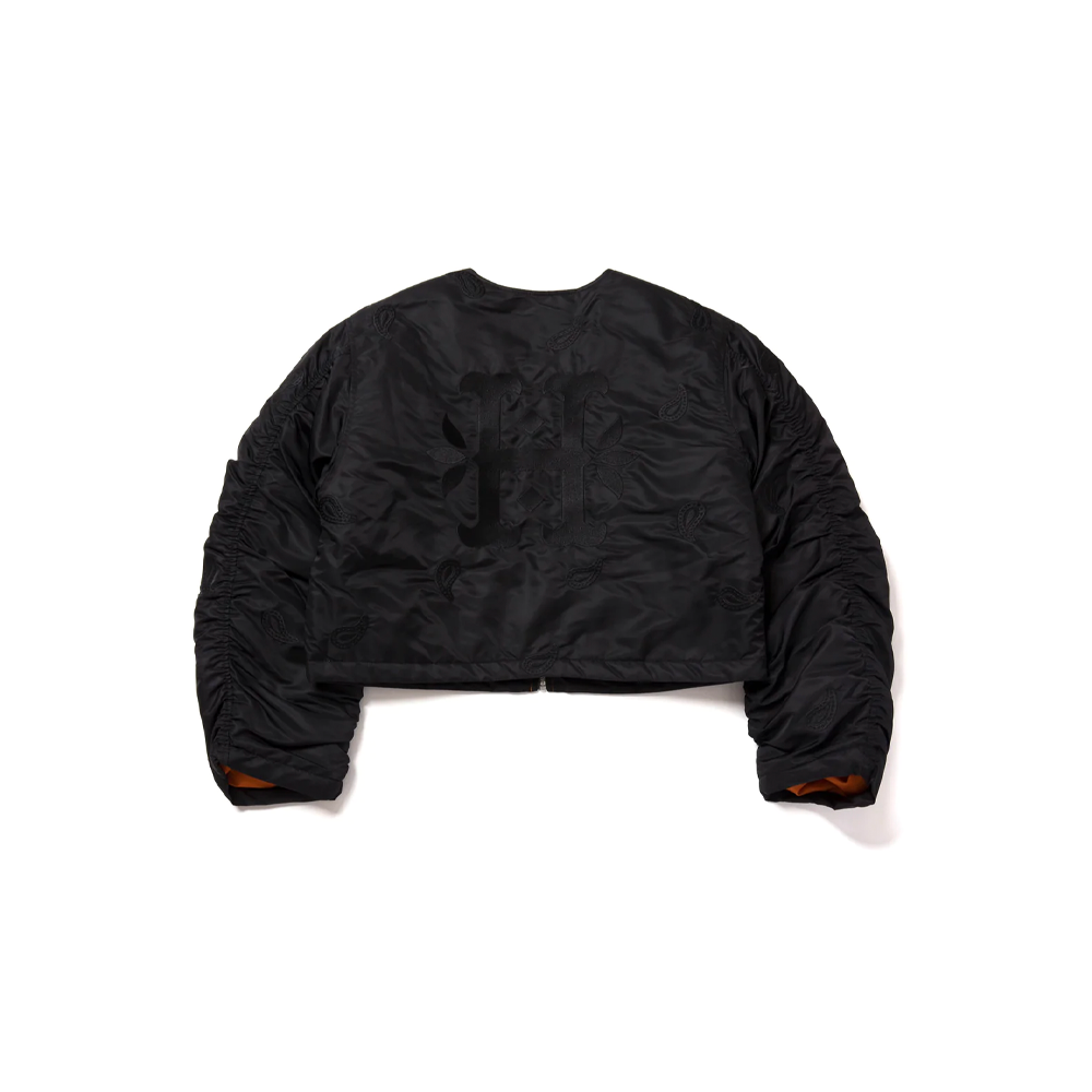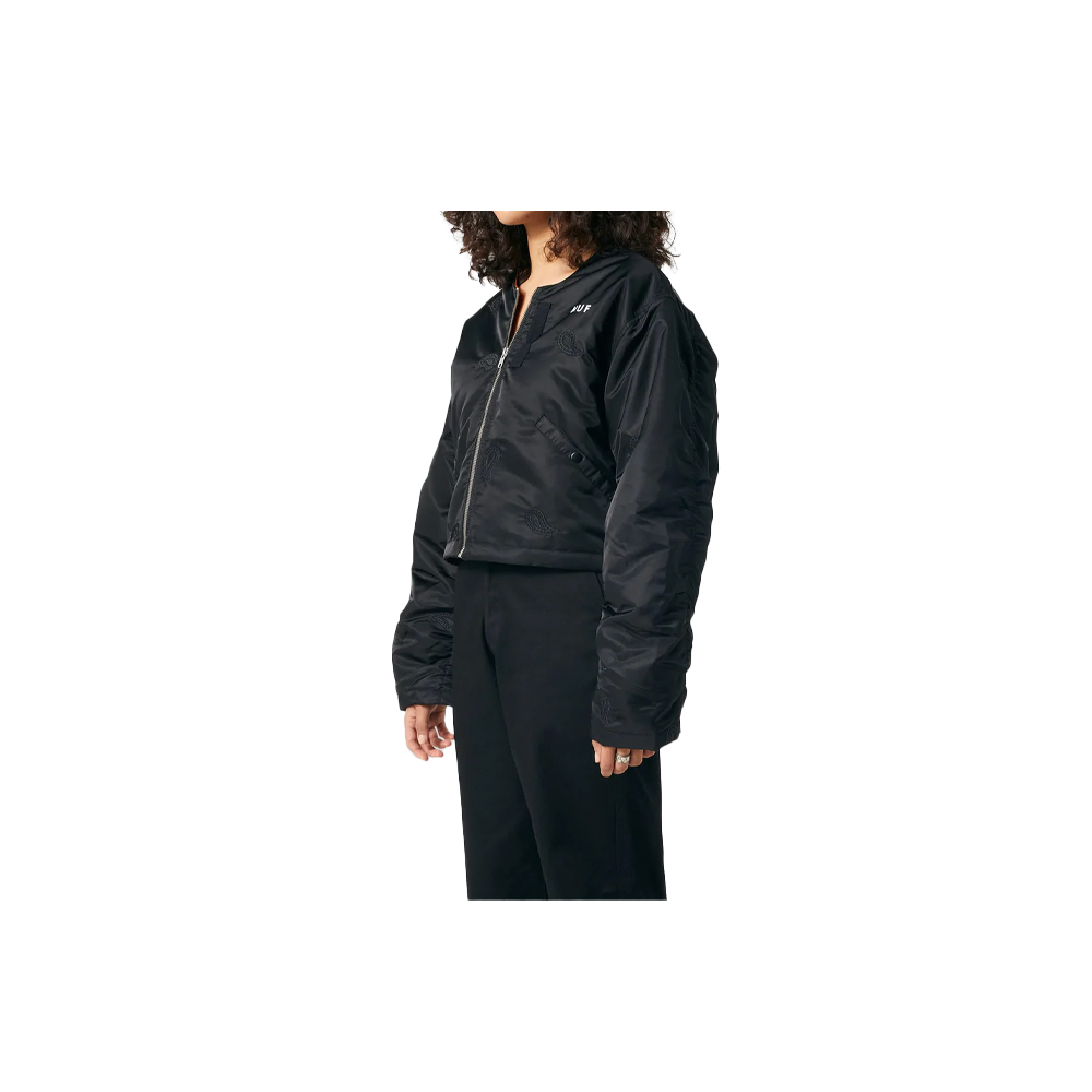 The HUF Crop Paisley Satin Bomber features contrast HUF logo embroidery at chest, satin embroidered Paisley and stylized H artwork at back.