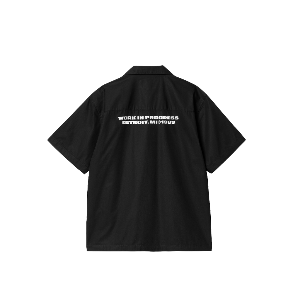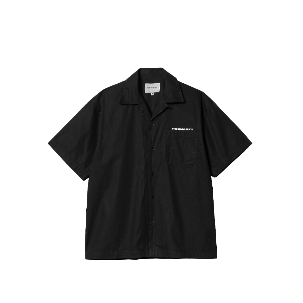 The Carhartt S/S Link Shirt is made of lightweight cotton poplin and features a loose fit. The shirt features a Hawaiian collar, button front and chest pocket. The front and back are embellished with writing.