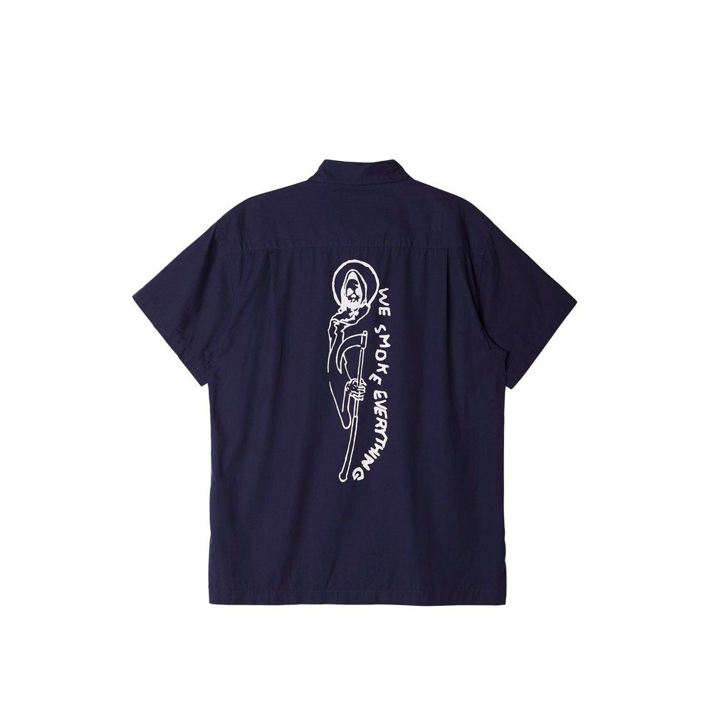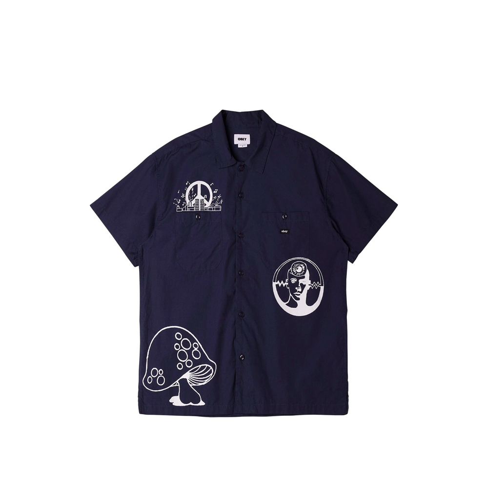 The Obey Oyster short-sleeved work shirt-style shirt is made from soft organic cotton and features buttoned chest pockets and custom graphics printed on the chest and back.