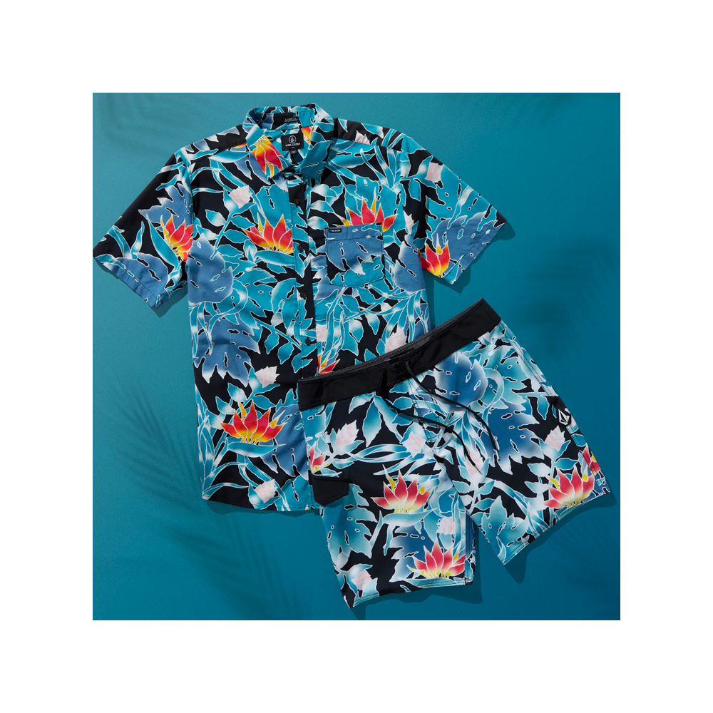 Breezy lo fa con la camicia a maniche corte da uomo Leaf Pit. Volcom Incanala le vibrazioni delle vacanze con ritagli floreali tropicali color inchiostro realizzati in leggera viscosa di cotone per una sensazione morbida e fluida. Completo di tasca sul petto, bottone frontale e logo Volcom in tessuto.