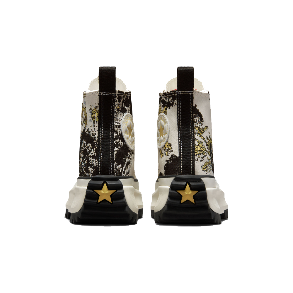 The tricolor woven jacquard renews this season’s Converse Run Star Hike with autumn floral textures, inspired by real fresh pressed and dried flowers. The egret-colored platform midsole is covered in black stripes, which matches the notched sole to create traction and style from the bottom. With a contrasting color star on the heel for a definitive look.